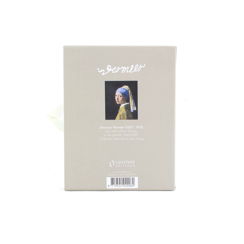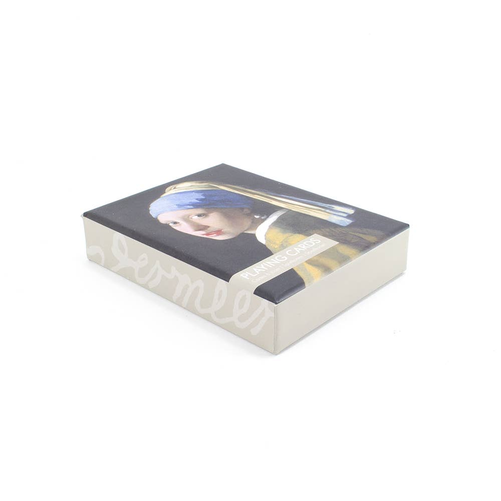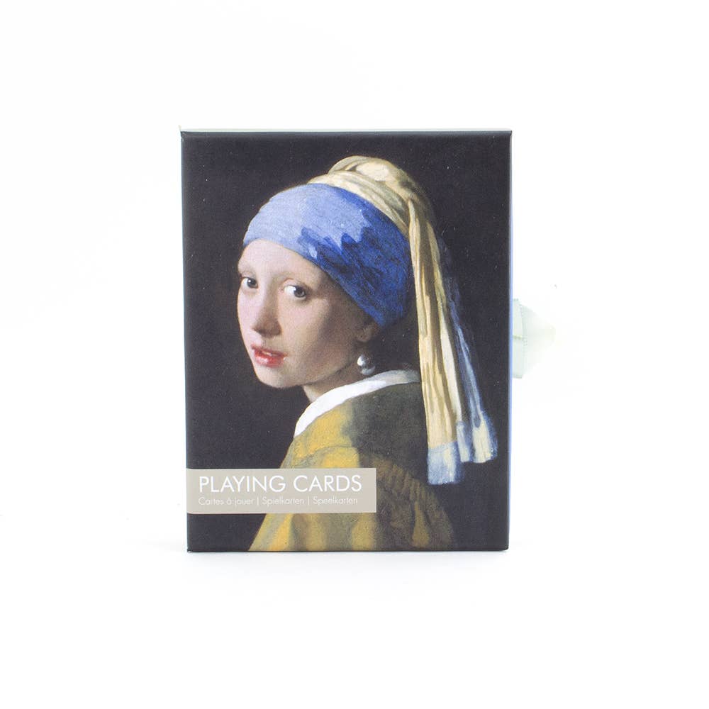Un juego de 2 cartas en una lujosa caja de regalo, con la imagen de la niña con el pendiente de perla pintada por Johannes Vermeer, el famoso pintor holandés