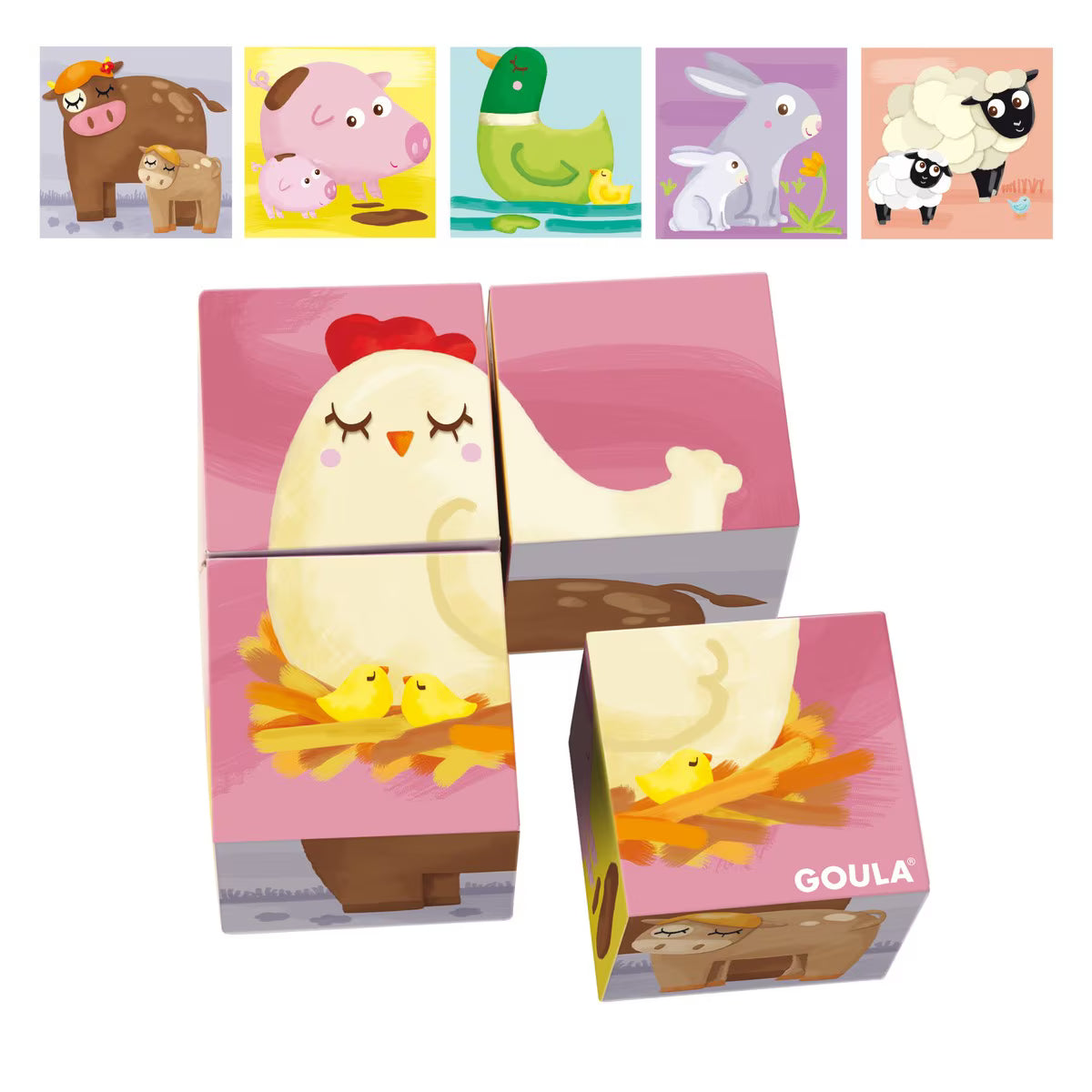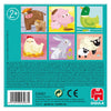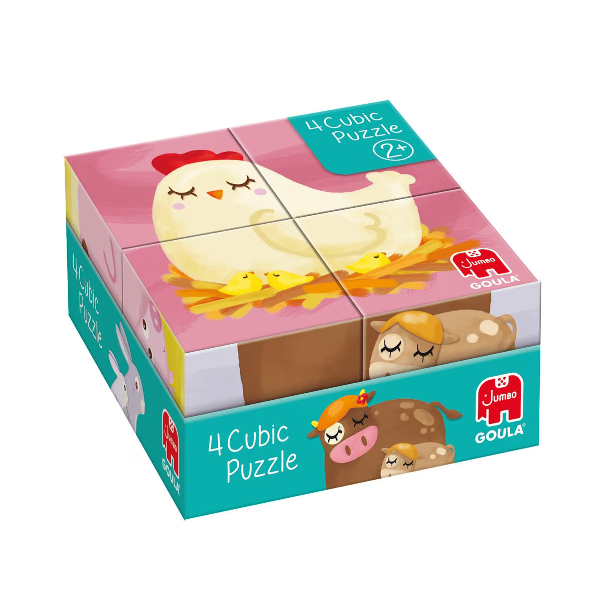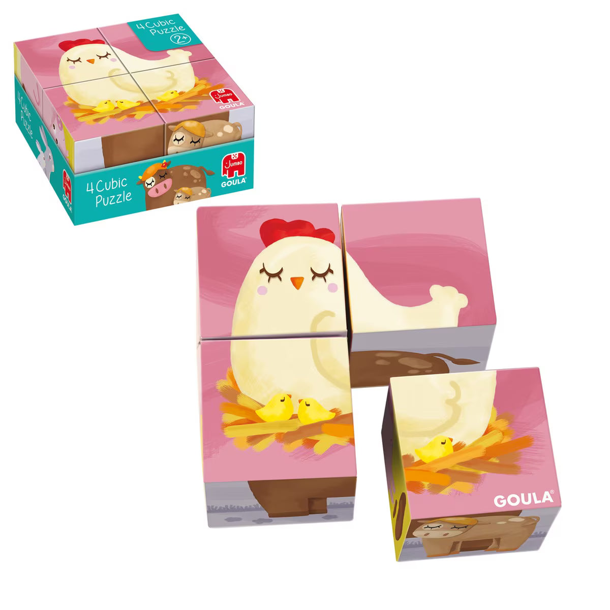 El Puzle cúbico de 4 cubos ilustrados con animales de la granja de Goula es un juguete educativo. Está compuesto por 4 cubos que presentan 6 ilustraciones diferentes de mamás y bebés de la granja, incluyendo gallina, vaca, cerdo, pato, conejo y oveja. Las ilustraciones están diseñadas para facilitar el encaje correcto de las piezas. La parte trasera de la caja incluye una guía con las ilustraciones, lo que ayuda en la construcción del puzle. Está fabricado en cartón.