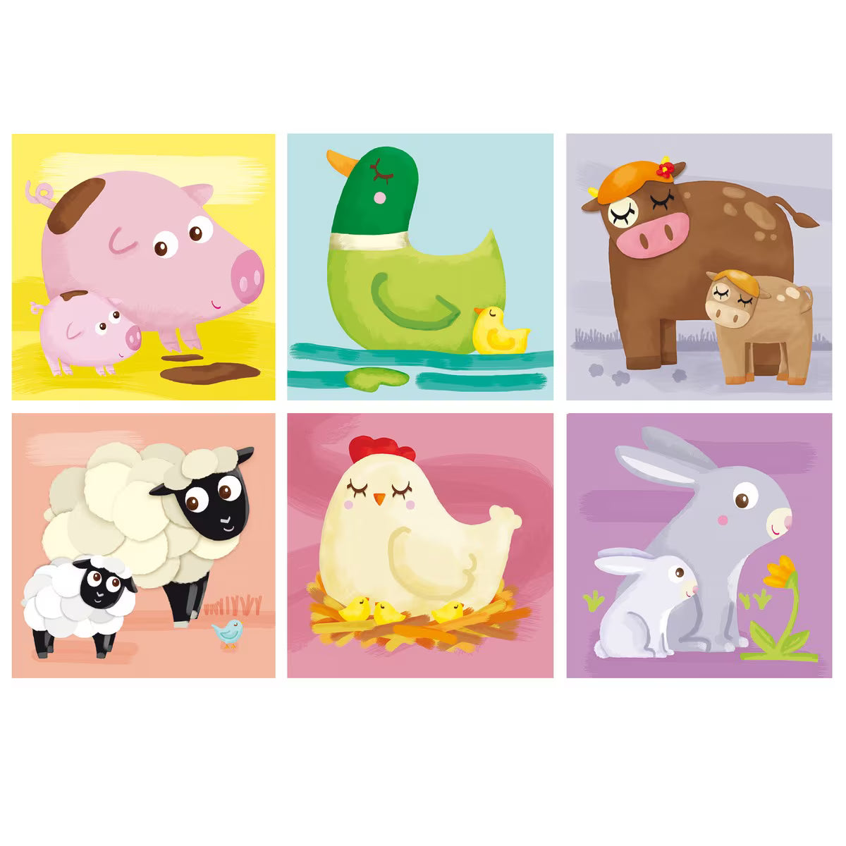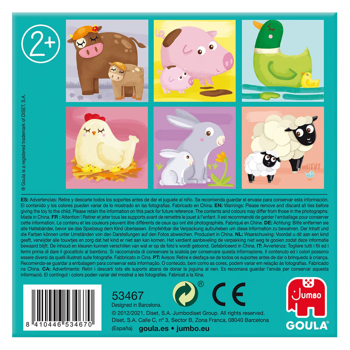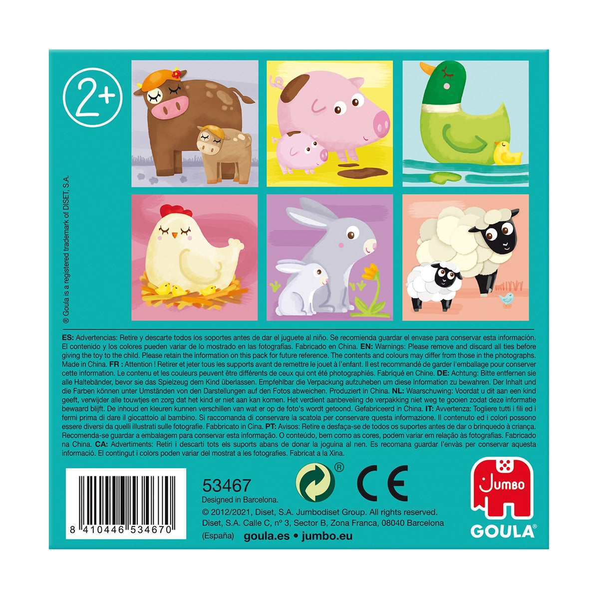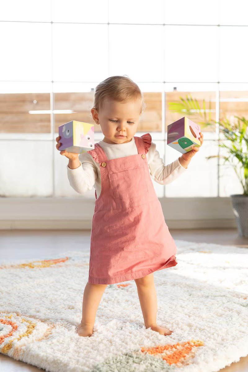 El Puzle cúbico de 4 cubos ilustrados con animales de la granja de Goula es un juguete educativo. Está compuesto por 4 cubos que presentan 6 ilustraciones diferentes de mamás y bebés de la granja, incluyendo gallina, vaca, cerdo, pato, conejo y oveja. Las ilustraciones están diseñadas para facilitar el encaje correcto de las piezas. La parte trasera de la caja incluye una guía con las ilustraciones, lo que ayuda en la construcción del puzle. Está fabricado en cartón.