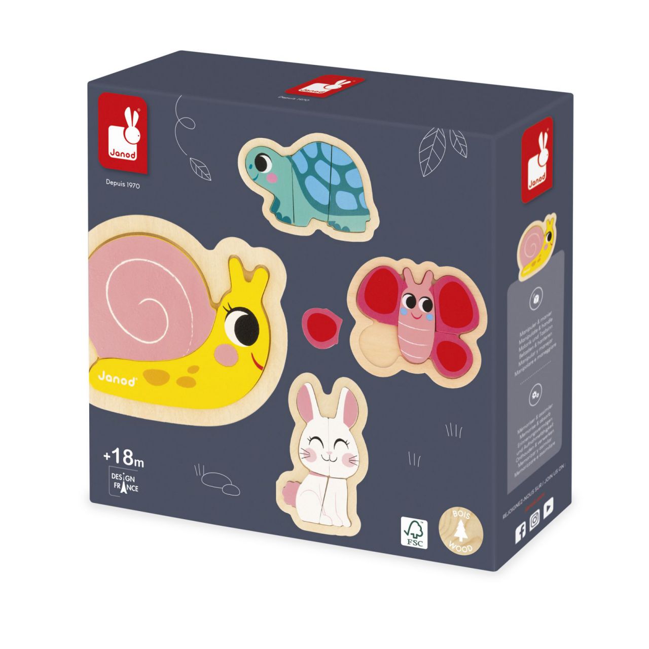 Este set de 4 puzles viene con encantadoras ilustraciones de animales del jardín: 🐢 un caracol de 2 piezas, 🐇 un conejo de 4 piezas, 🦋 una mariposa de 5 piezas y 🐢 una tortuga de 3 piezas. ¡Los pequeños amarán a estos amiguitos!