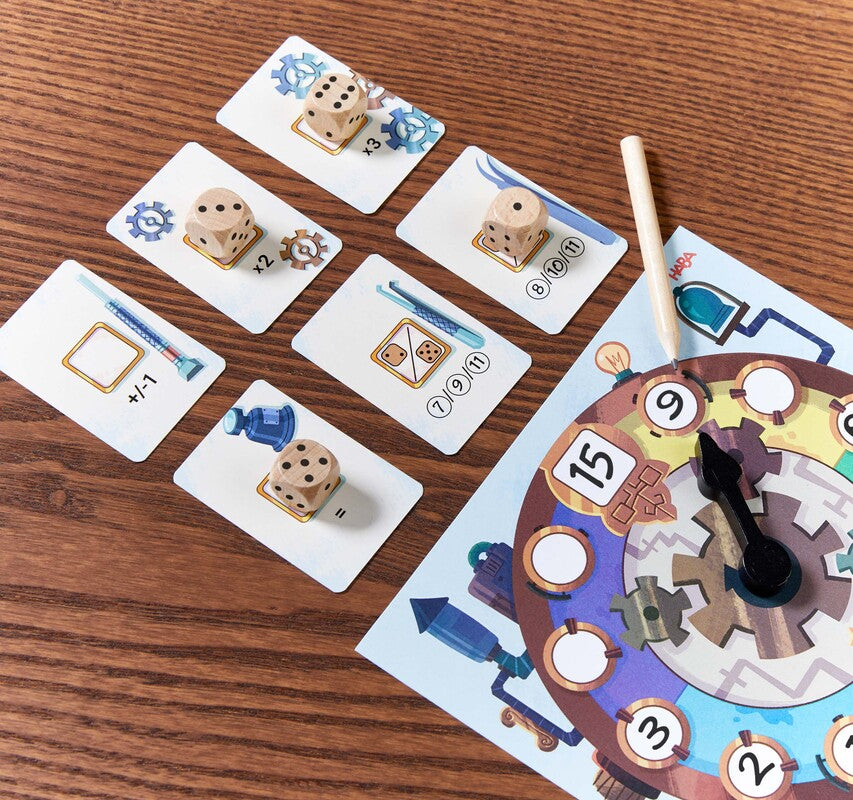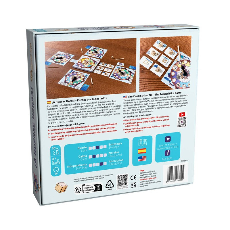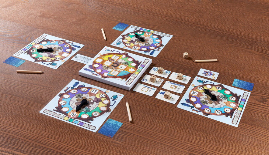 Juego Roll&Write en el que cada jugador/a se convierte en fabricante de relojes especiales. En cada ronda se lanzan los dados y por turnos cada jugador usará uno de ellos en combinación con las operaciones de las cartas del centro para así añadir un número a su reloj. Después de 12 rondas, el relojero que mejor cumpla con los requisitos de sus clientes, logrará más puntos y ganará la partida.