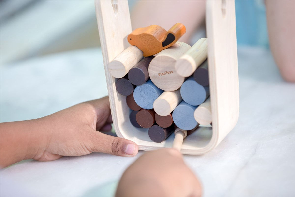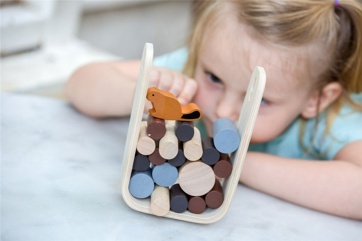 🌲 Saca los troncos uno a uno de la represa usando el palo sin que el castor se caiga. ¡El jugador que logre salvar al castor, gana!