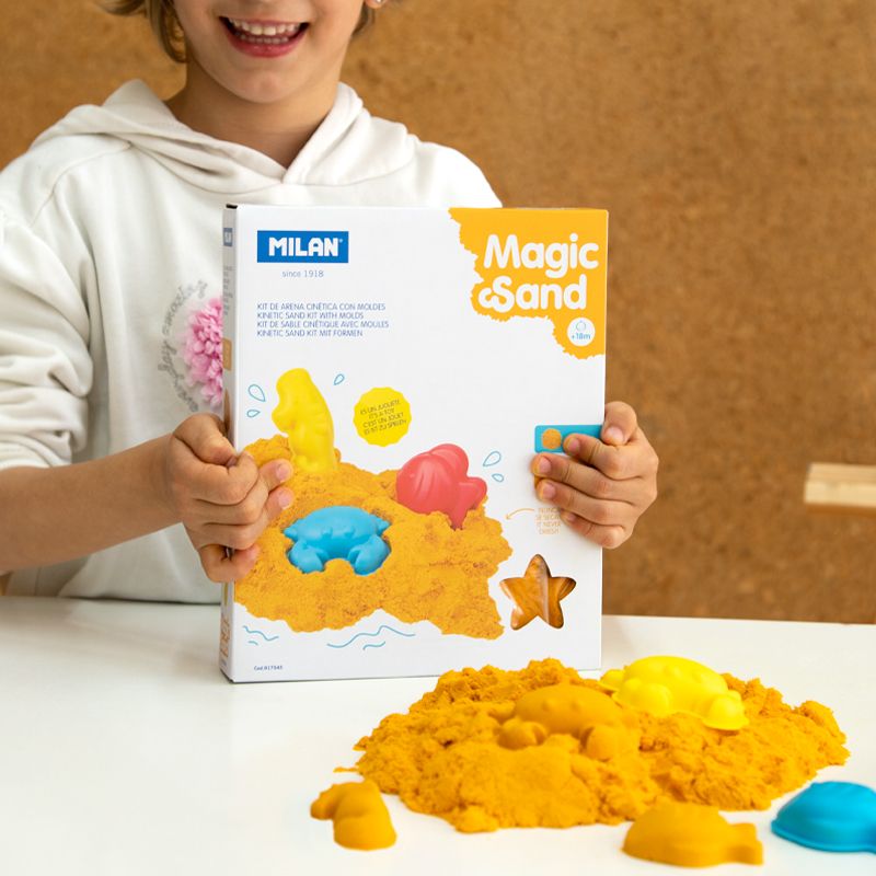 Arena cinética especial para niñas y niños a partir de 18 meses. Suave y sedosa al tacto, fácilmente manejable, para crear formas con gran definición con los 3 moldes incluidos. Ingredientes: 94% de arena, silicona, vaselina y colorante alimentario. Nunca se seca. Bolsa de 453 g.