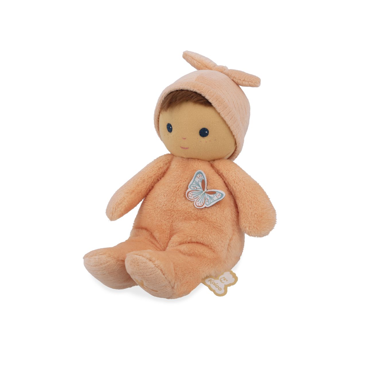 🌼 Diseño adorable: Cuerpo color melocotón, brillantes ojos azules y un sombrerito atado que invita al juego.