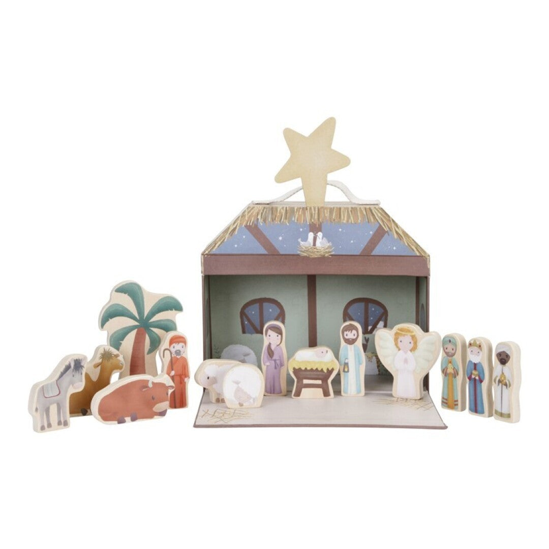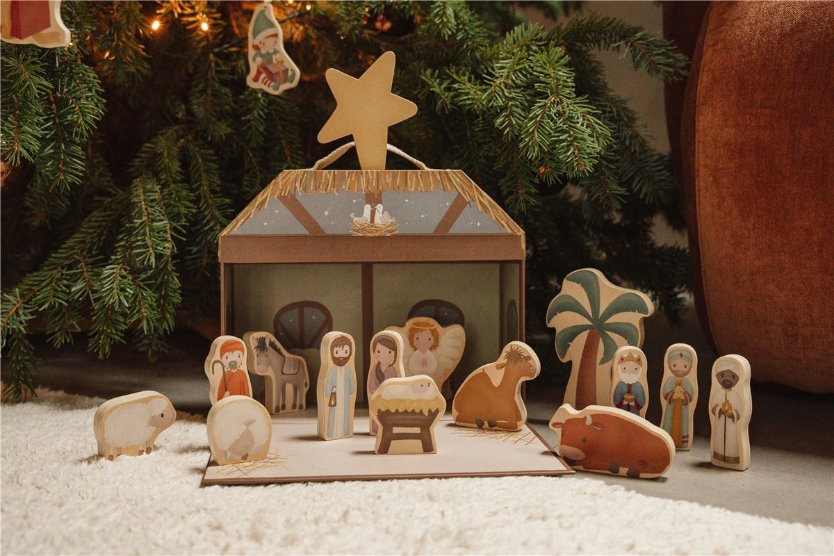 Play box con todos los personajes del Belén. La caja es portátil y fácil de guardar. Está hecho de cartón macizo y las figuras son de madera. Incluye niño Jesús, José y María, ángel, pastor, burro y buey, 2 ovejas, reyes magos, camello, palmera y estrella.