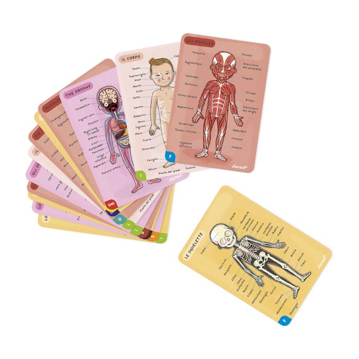 - Aprenderán sobre el esqueleto, los órganos, los músculos y el cuerpo humano en general, con tarjetas detalladas que explican cada parte y su función.
