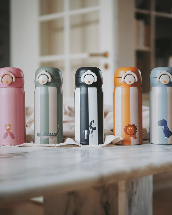 Nuestro Botella de agua de acero inoxidable de 350 ml para niños en edad preescolar y escolar. Sin pajilla para fines higiénicos y fácil limpieza, es a prueba de fugas y apta para lavavajillas. La elección ideal para niños activos en movimiento. Elige entre 5 estilos.