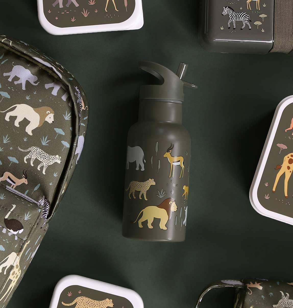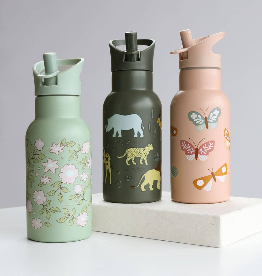 Esta botella de acero inoxidable con doble pared está pensada para que podáis llevar vuestra bebida favorita al cole, al bosque encantado o al picnic real.