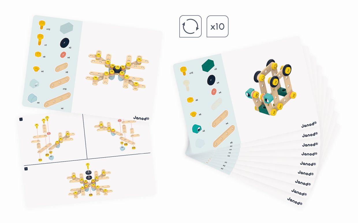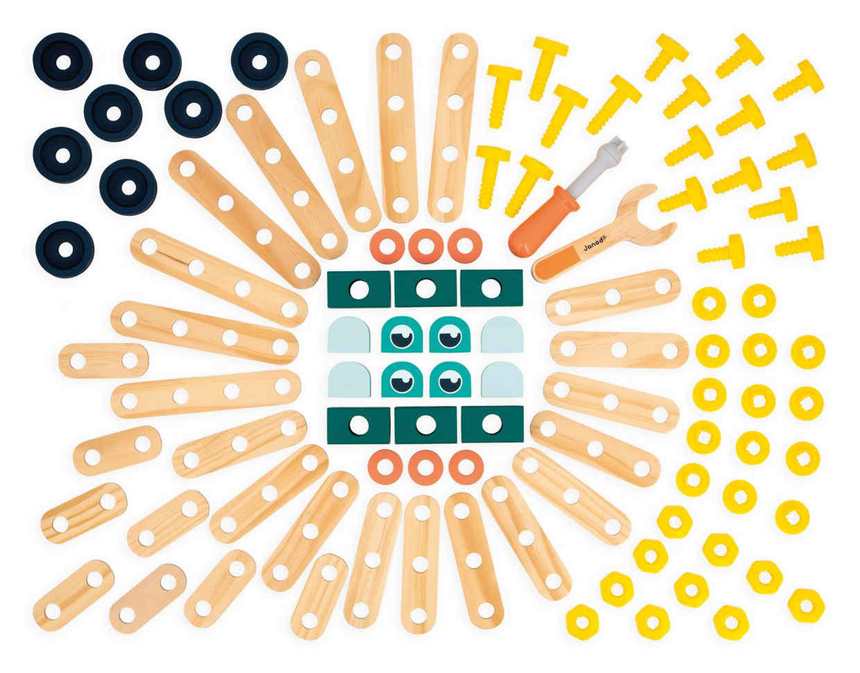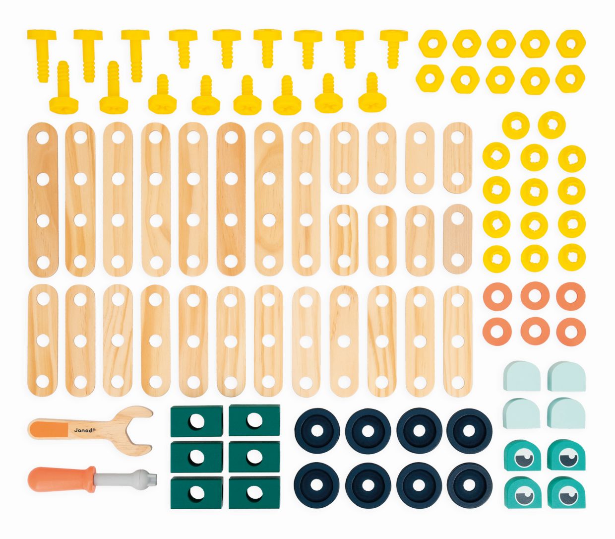 - 100 accesorios de madera: Incluye piezas como arandelas, placas, tuercas y tornillos para que los niños puedan construir lo que su imaginación les dicte. 🛠️