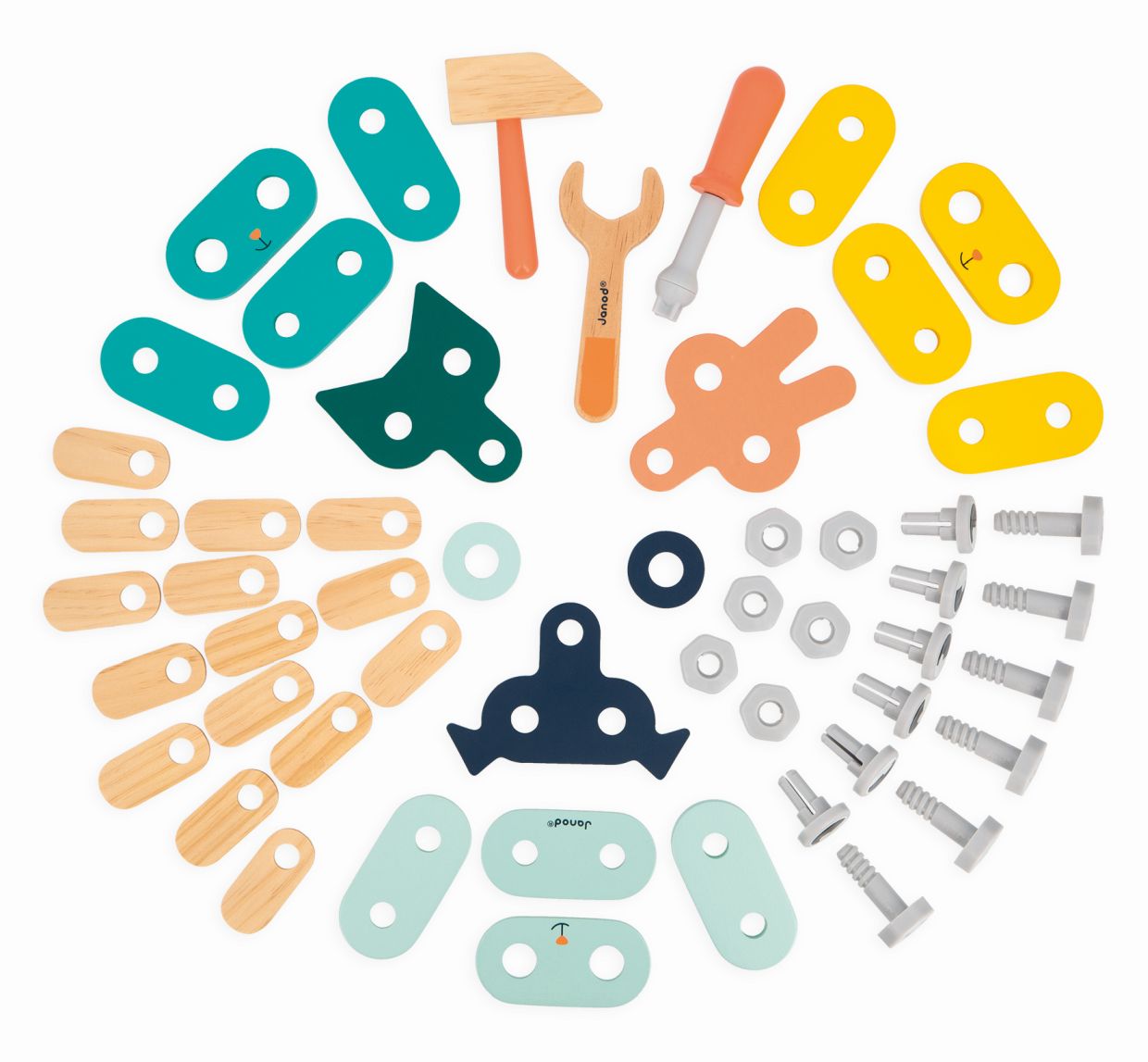 - Las piezas de tornillería tienen muescas, lo que imita las herramientas reales, pero es más fácil de manejar para sus pequeñas manos 👦👧.