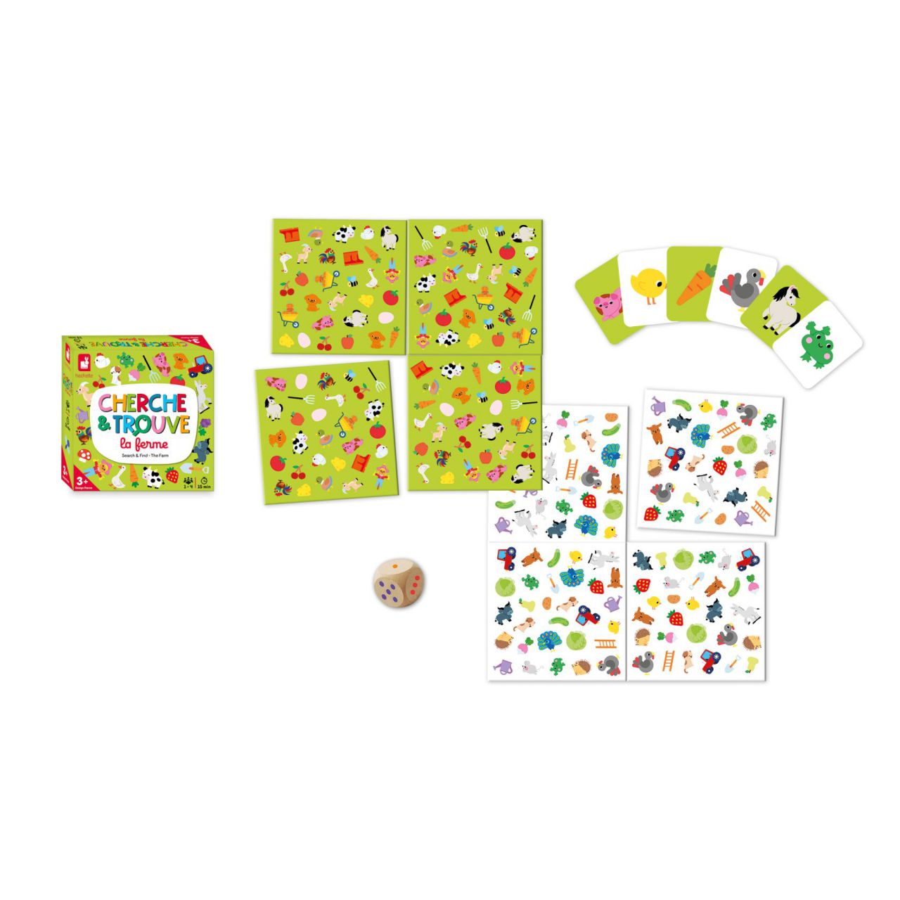 Objetivo del juego: Encuentra el elemento de tu carta tantas veces como el número que salga en el dado. 🌟 ¿Serás capaz de localizar las gallinas 🐔, frutas 🍓 o incluso las máquinas agrícolas 🚜 en el tablero? ¡La granja está llena de sorpresas!