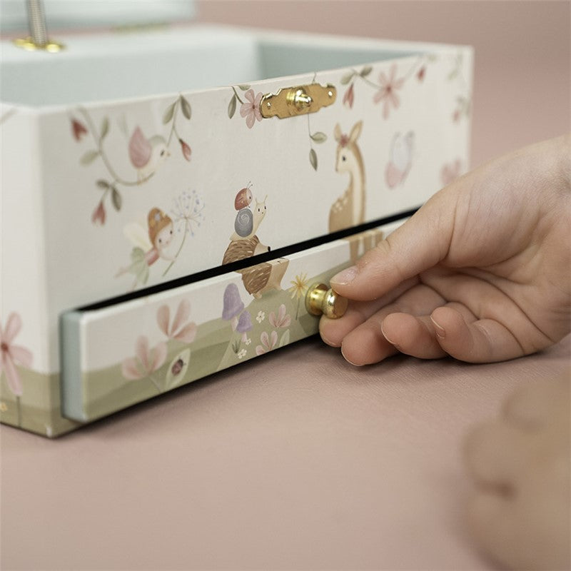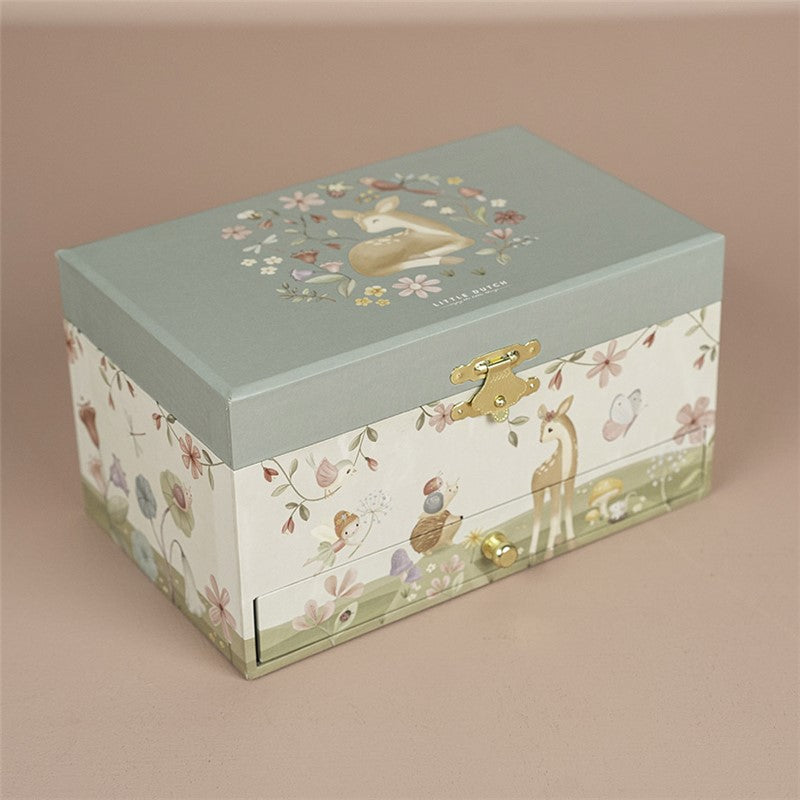 Guarda tus pequeños tesoros en este encantador joyero musical inspirado en el mágico mundo de Forest Friends. Con un diseño lleno de dulzura, incluye un compartimento especial para anillos, un práctico cajón y una figura de ciervo que gira al ritmo de la música. 🎵