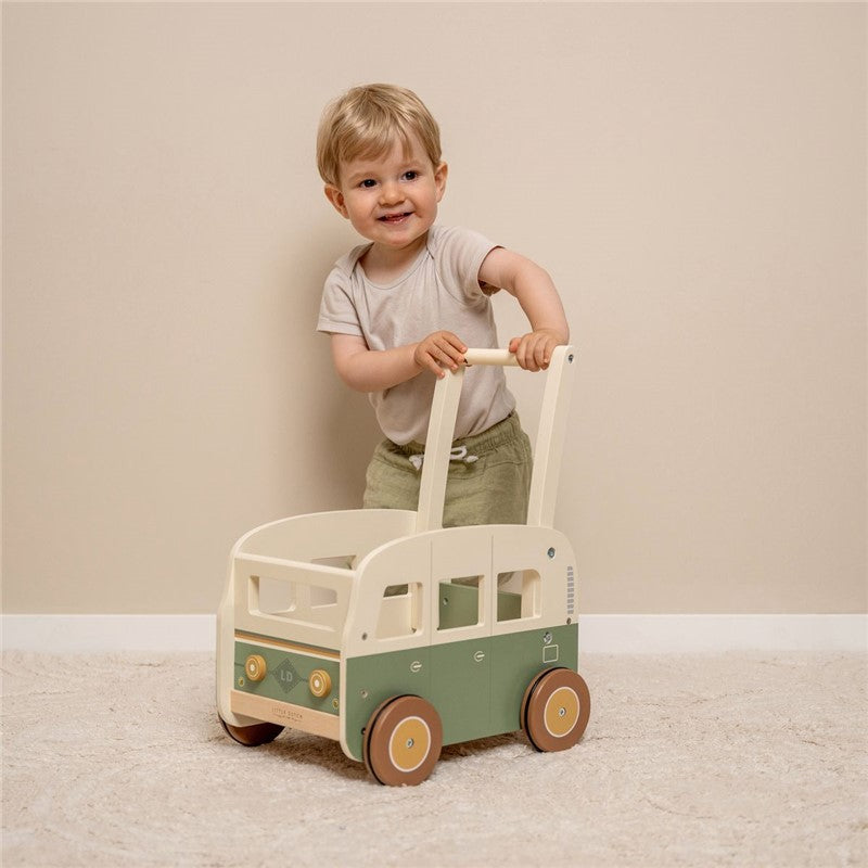 ¡Es hora de dar los primeros pasos con estilo! Este encantador carro de empuje de madera, con un diseño de furgoneta surfera vintage, será el compañero perfecto para que tu pequeño aprenda a caminar mientras se divierte. 🌈👶
