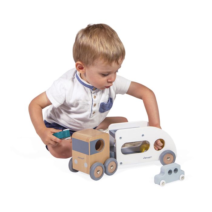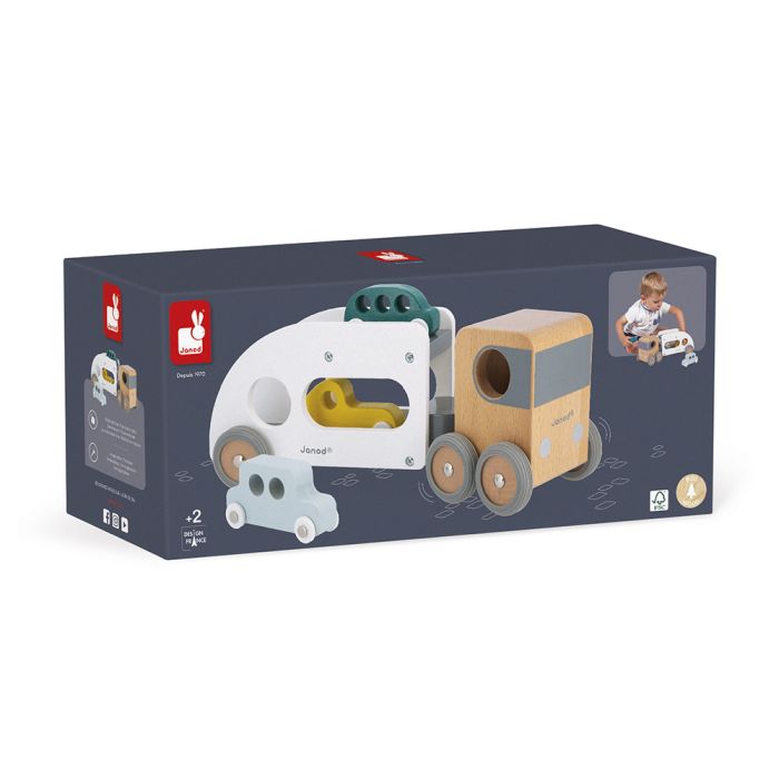 🌳 Fabricado en madera maciza con certificado FSC® y pintado con pintura al agua, este camión garantiza seguridad y durabilidad.