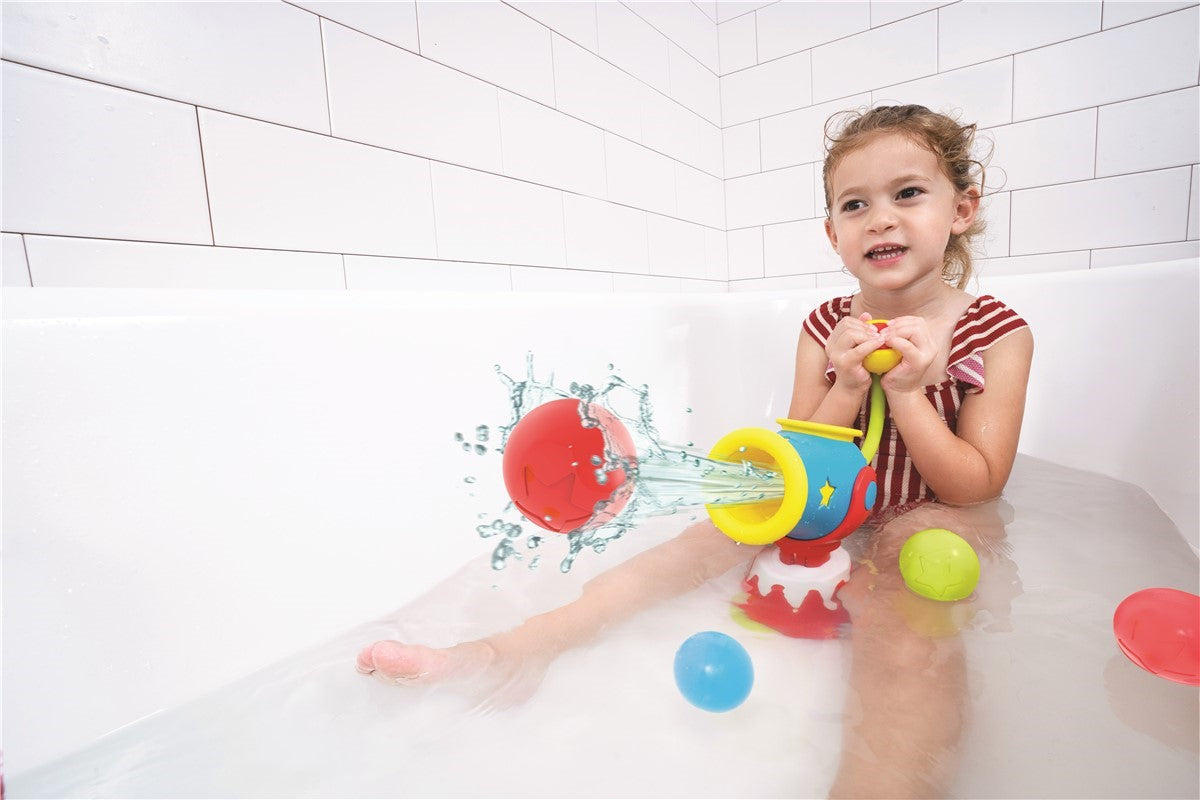 Este cañón de agua dispara 5 bolas y agua a través del aro, involucra a tu hijo mientras aprende a apuntar y mejora practicando. Enseña la prueba y error y la causa y efecto, le anima a compartir su juego con otros, el cañón puede ajustar la posición, viene con una cómoda cesta para guardarlo.