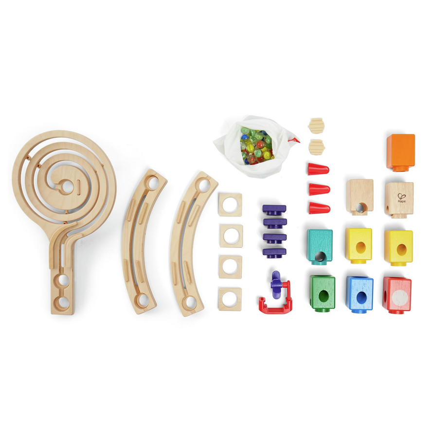 - Accesorios incluidos: Incluye 9 bloques distribuidores, 2 raíles curvados, un recodo en espiral, 4 ajustadores de altura, 4 aros estabilizadores, 3 aceleradores, 2 obturadores de orificio, 3 canicas, un girador de molino de viento y una abrazadera universal.