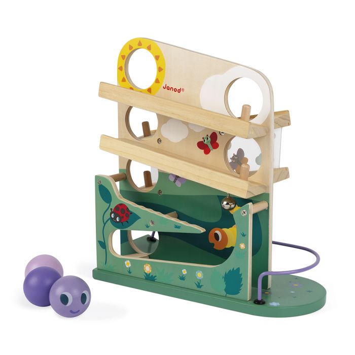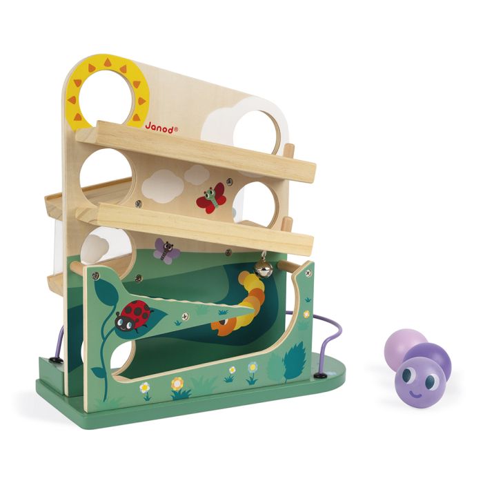 ¡Una oruga que cae del cielo! 🐛🌥️ Este circuito de madera encantado hará que los más pequeños descubran un montón de cosas mientras siguen el recorrido de colores campestres 🌈 y sus tres bolas moradas 🟣.