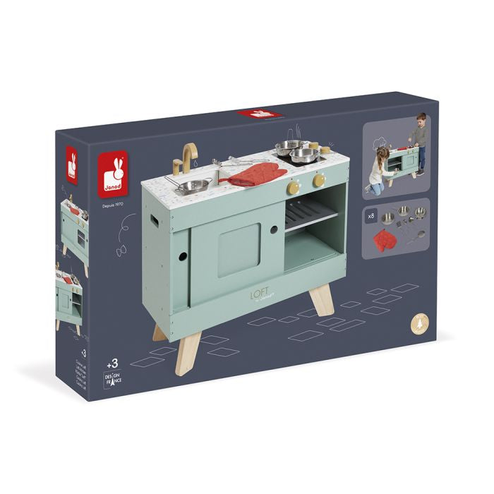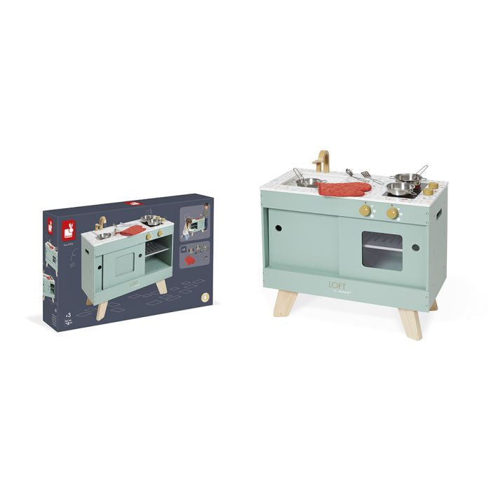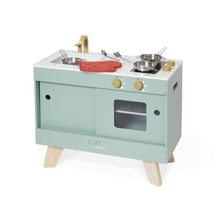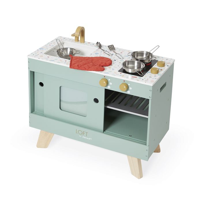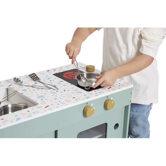 Con un diseño moderno y encantador en tonos verde oliva y una encimera estilo terrazo, esta cocina de madera para niños a partir de 3 años será el centro de grandes aventuras culinarias. 🌿✨