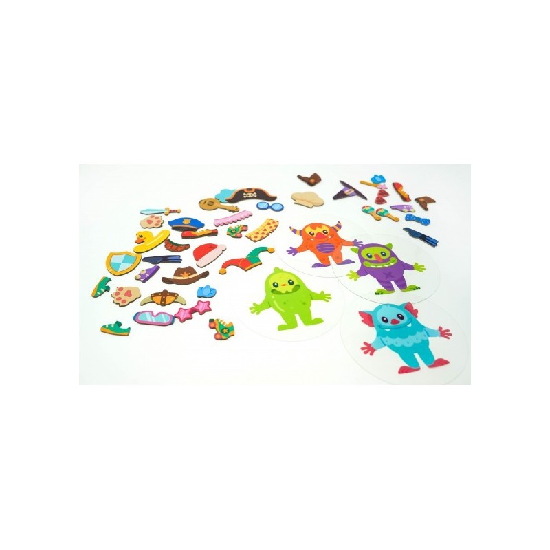 Cada jugador tiene su propio monstruo, en una pieza redonda de acrílico. Por otro lado, tenemos varios complementos y ropajes que se amontonarán sobre la mesa.