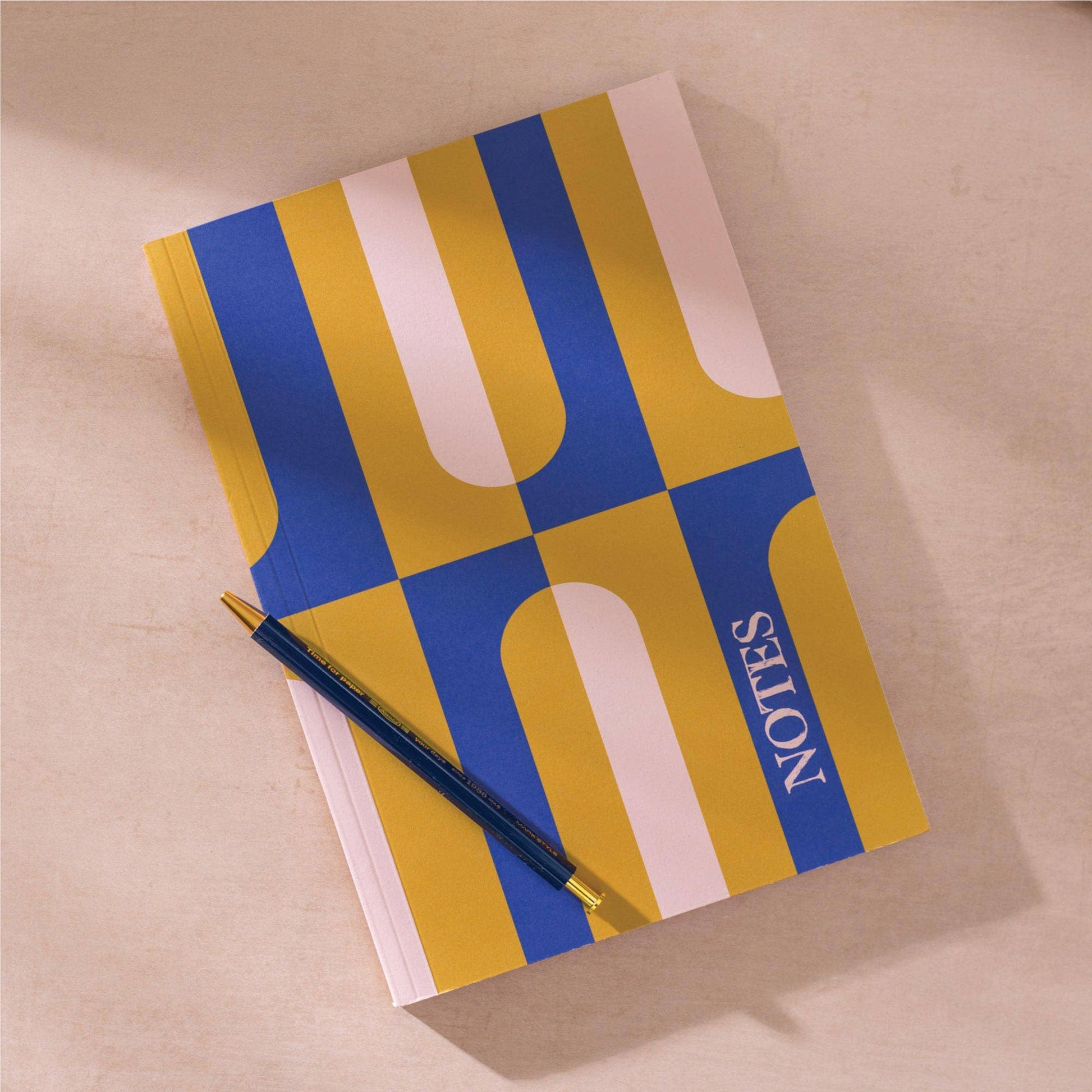 Los colores Chartreuse (nuestro color favorito aquí en el estudio) y Deep Blue en un cuaderno de diseño geométrico.