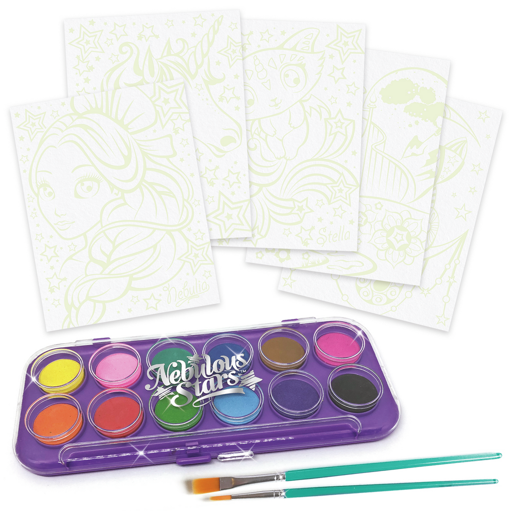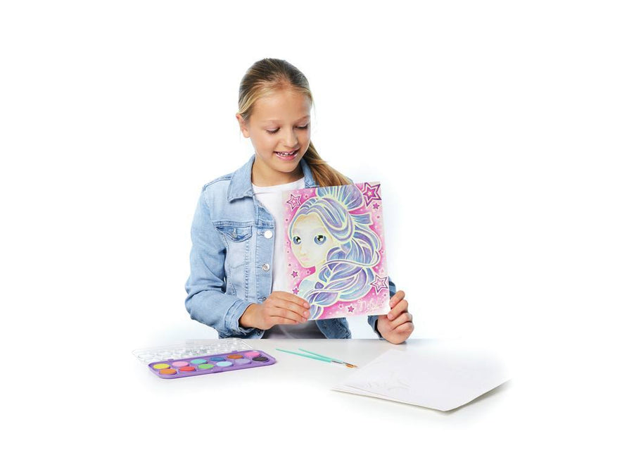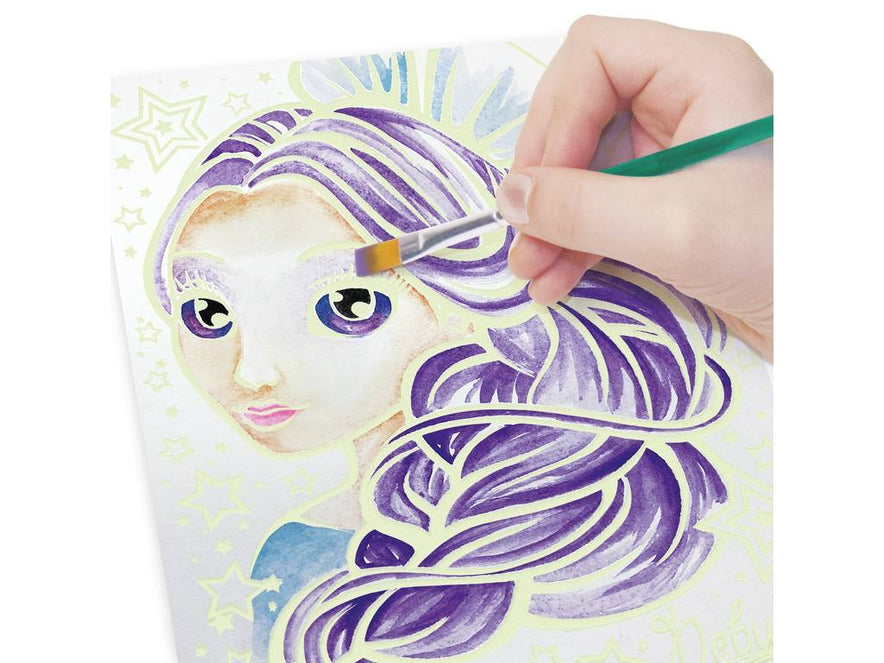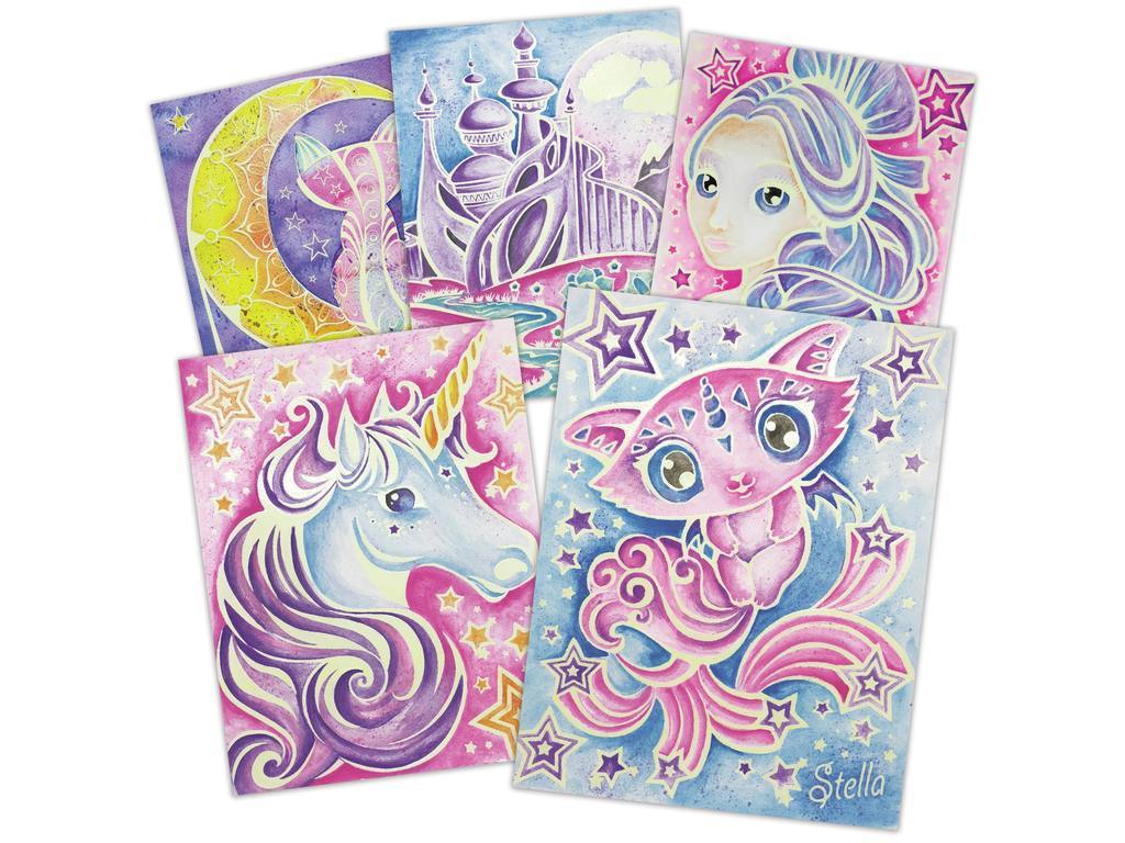 Acuarela mágica: 5 cuadros mágicos. Pinta de forma mágica 5 bonitos cuadros. Gracias al trazado prepintado y fluorescente, la acuarela se queda solo en las áreas adecuadas. ¡Tu obra maestra brillará en la oscuridad!