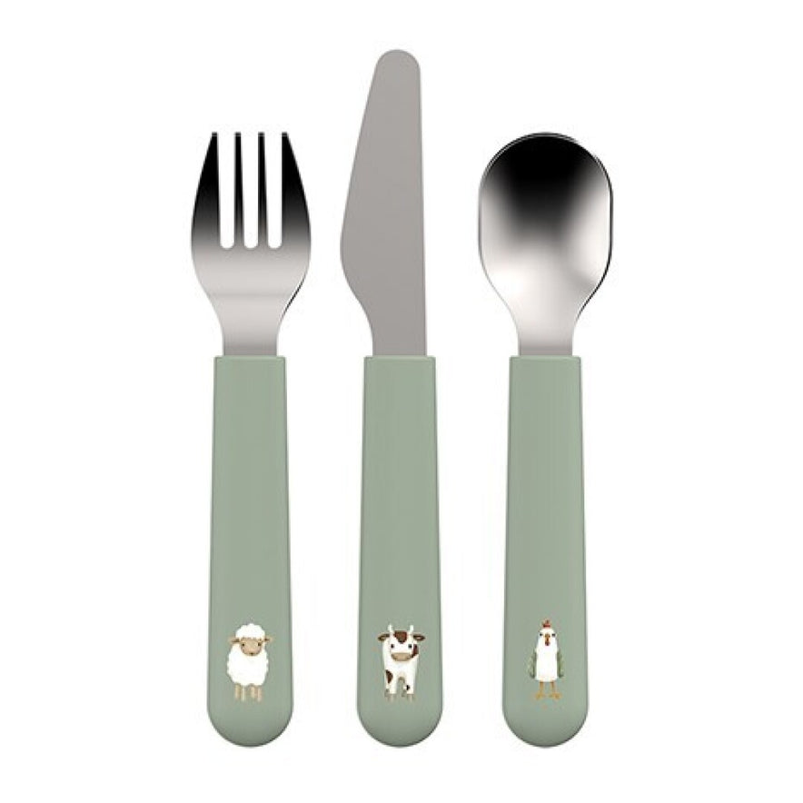 Para niños pequeños y preescolares (2 a 3 años). Hecho de acero inoxidable, con mangos de plástico que los hacen cómodos de sostener. Libre de BPA. Apto para lavavajillas.