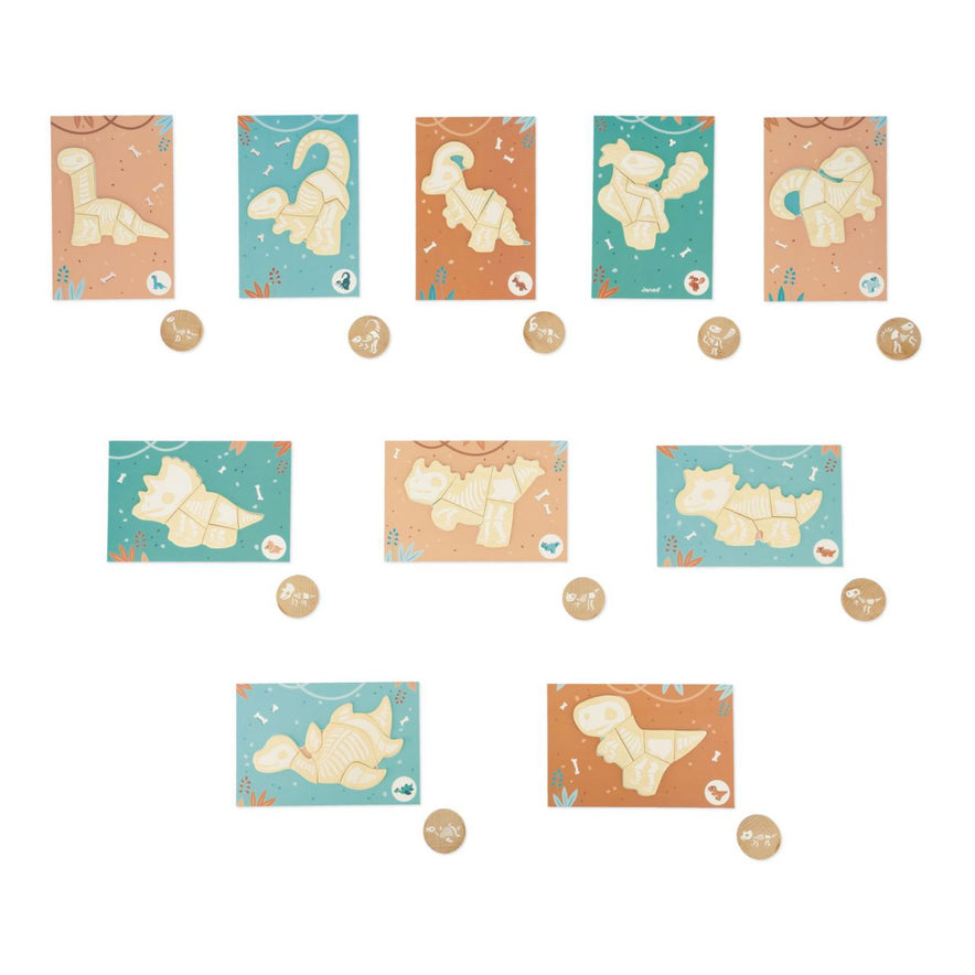 - Tarjetas de enigmas con pistas visuales: Cada tarjeta de enigma incluye una pista visual del dinosaurio, lo que ayudará a los pequeños paleontólogos a identificar los huesos correctos. ¡Es como estar en una auténtica excavación! 🔎