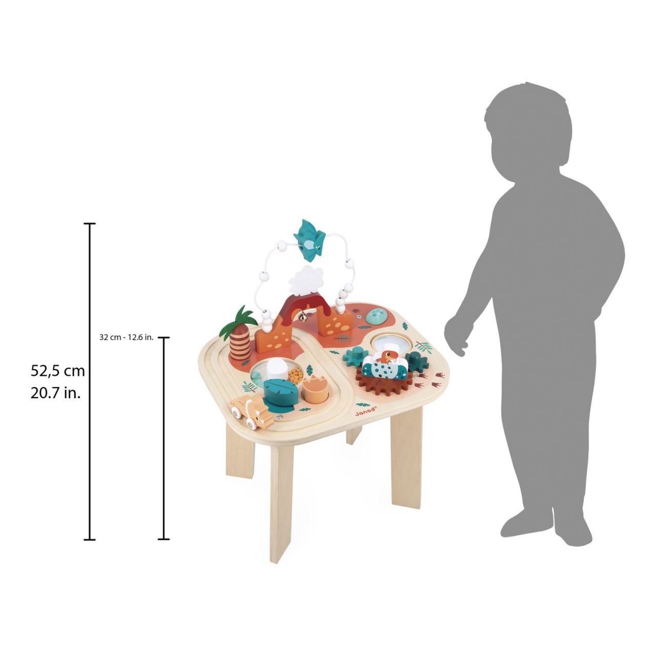 Hecho con madera FSC® de alta calidad, este juguete de estimulación visual y motricidad es ideal para el desarrollo de la concentración y curiosidad de los bebés. ¡Los adorables dinosaurios y los bonitos detalles de colores harán que esta mesa de actividades se convierta en una pieza clave para el aprendizaje y la diversión! 🌟👶
