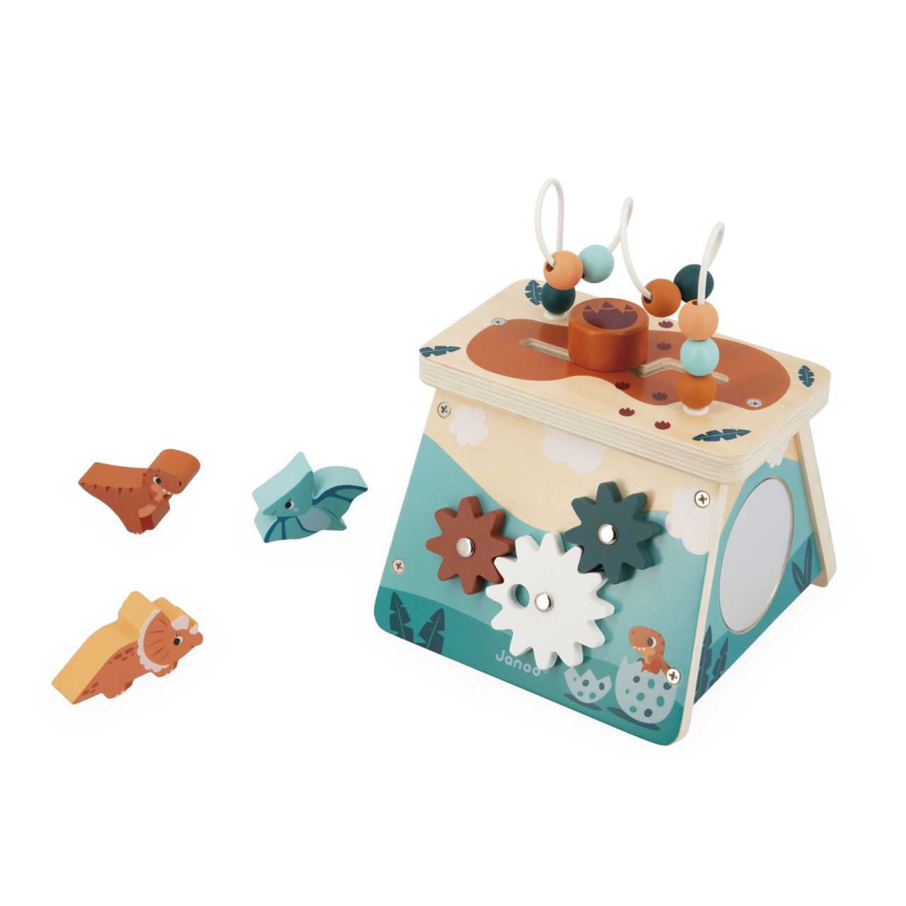 En la cara trasera, hay tres engranajes giratorios para que los pequeños experimenten por primera vez la rotación y la velocidad, ejercitando su destreza. 🛠️⚙️ En el lado izquierdo, el bebé se divertirá con su reflejo en el espejo, y en lo alto del volcán disfrutará de otros dos juegos: un laberinto y un ábaco con 8 cuentas de madera. 🔄🪙
