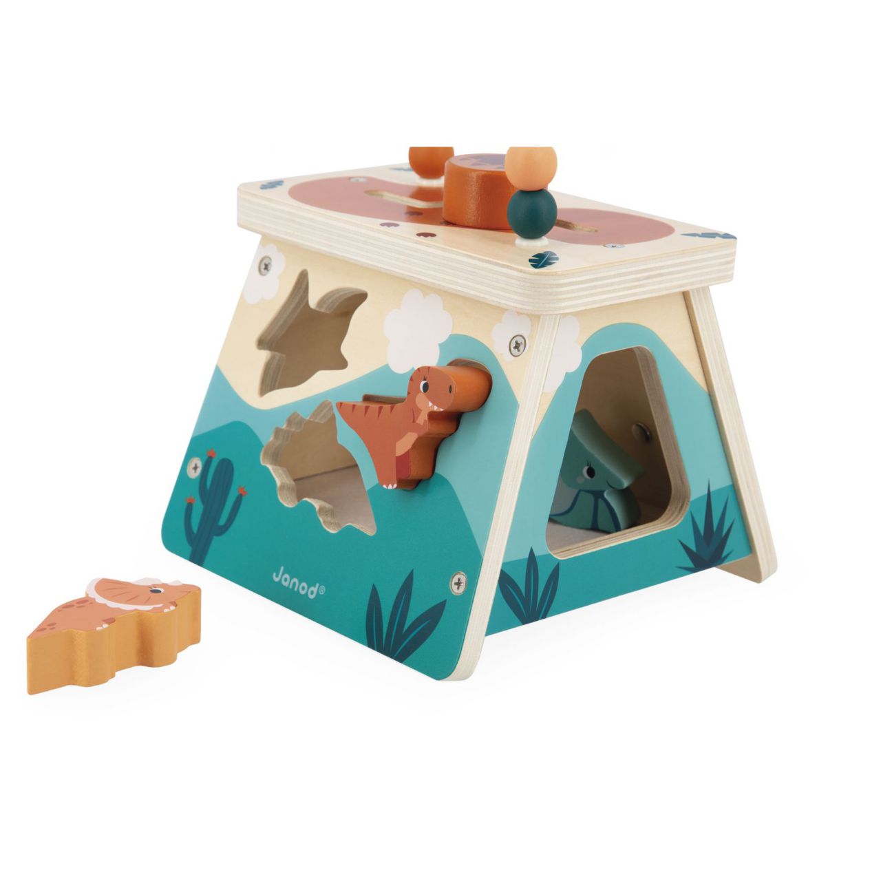 En la cara delantera, hay una caja de formas con unos dinosaurios de madera que hay que pasar por el agujero adecuado. 🦕 Los niños tendrán que pensar un poco para saber dónde van esos preciosos tiranosaurio, tricerátops y pteranodón. 🦖🦖 ¡Gracias al fieltro del fondo de la caja, los dinosaurios no hacen ruido al caer! Luego, se mete la mano por el lateral para volver a coger todas las piezas de madera. 👶👋