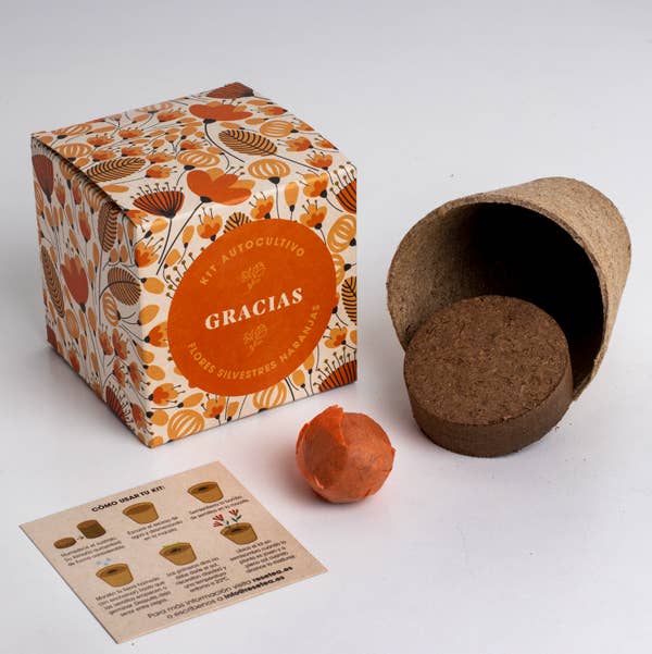 ¿Tienes algo que decir a alguien importante? Con este kit podrás hacerlo a la vez que le regalas una bonita experiencia llena de vida y de color. Este kit contiene 1 maceta de germinación 100% biodegradable, 1 pastilla de turba y 1 bomba de semillas con flores silvestres naranjas. Su uso es muy sencillo. Hidrata el sustrato, después desmenúzalo en la maceta biodegradable. Semientierra la bomba de semillas. Riega todos los días sin encharcar. Alrededor del décimo día de haber brotado, introduce la maceta biodegradable en la maceta definitiva y disfruta de tus flores.