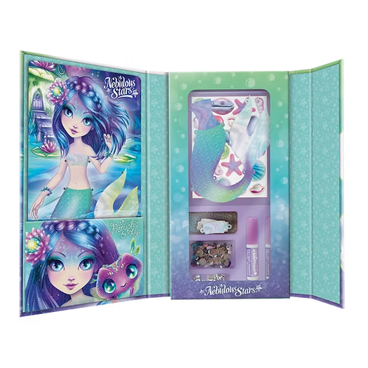 ¡A Nenuphia le encanta nadar como una sirena! Hazle 15 colas de sirena con conchas de papel y purpurina. Vístela colgando tus creaciones en el cartón rígido.