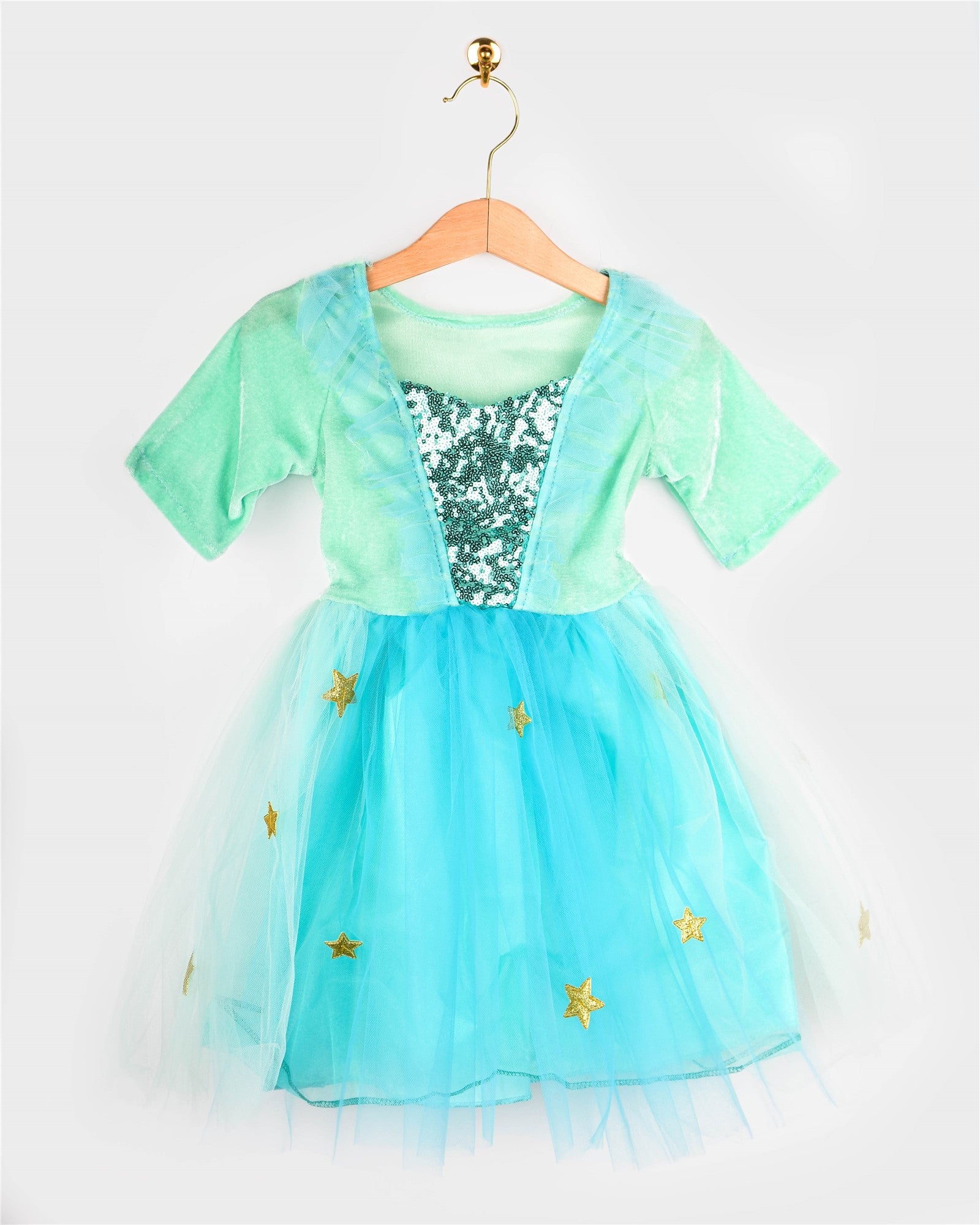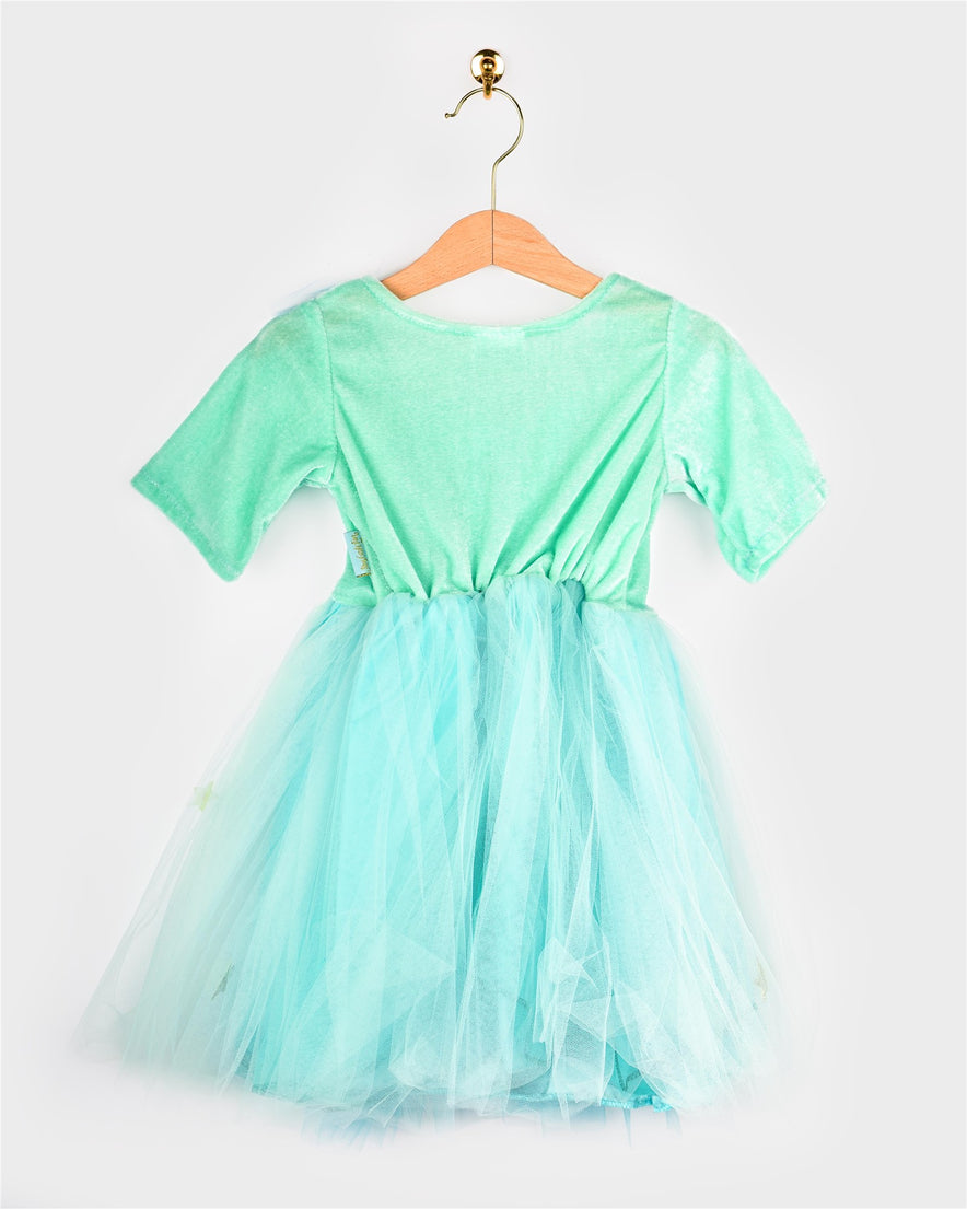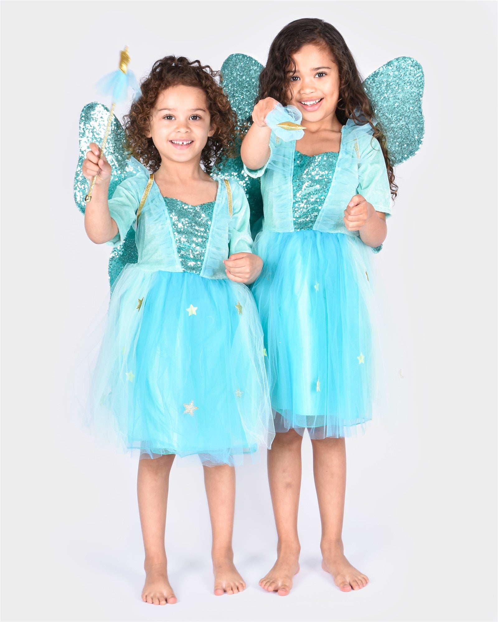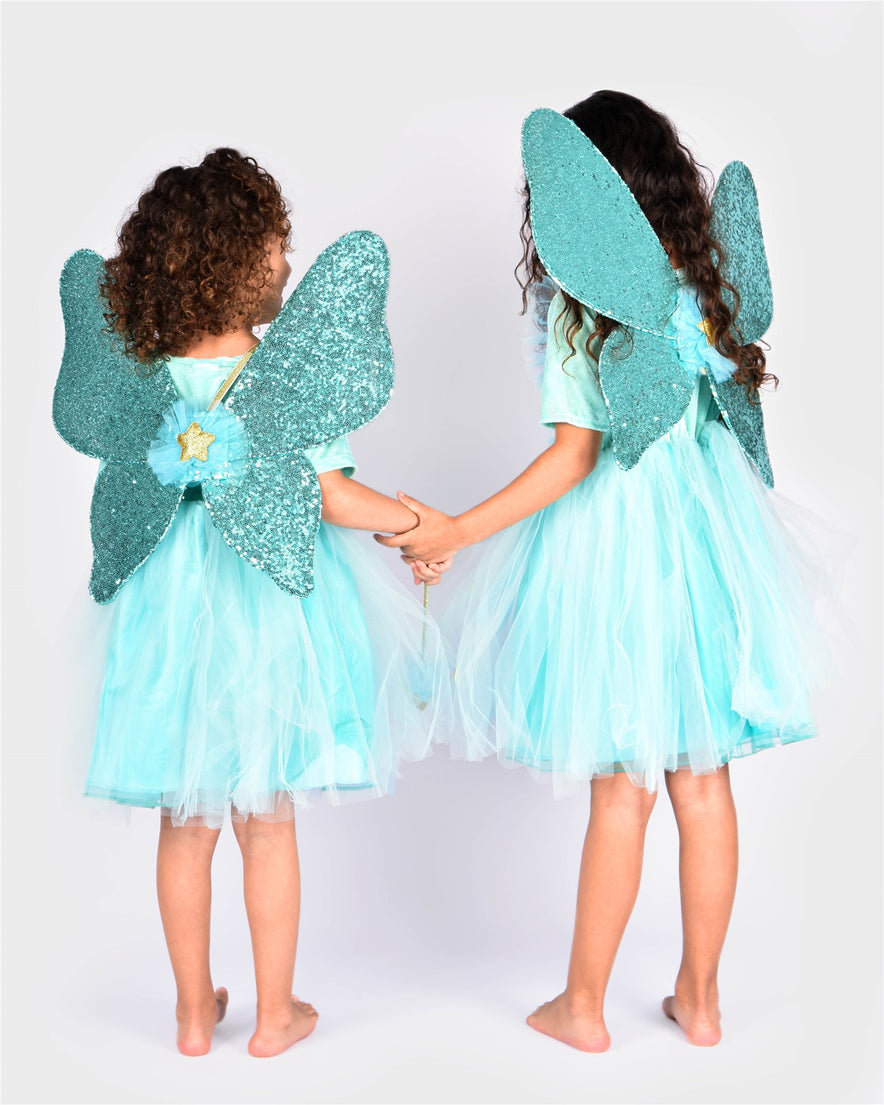 • Diseño mágico: Un disfraz turquesa que incluye un vestido, alas y una varita mágica.