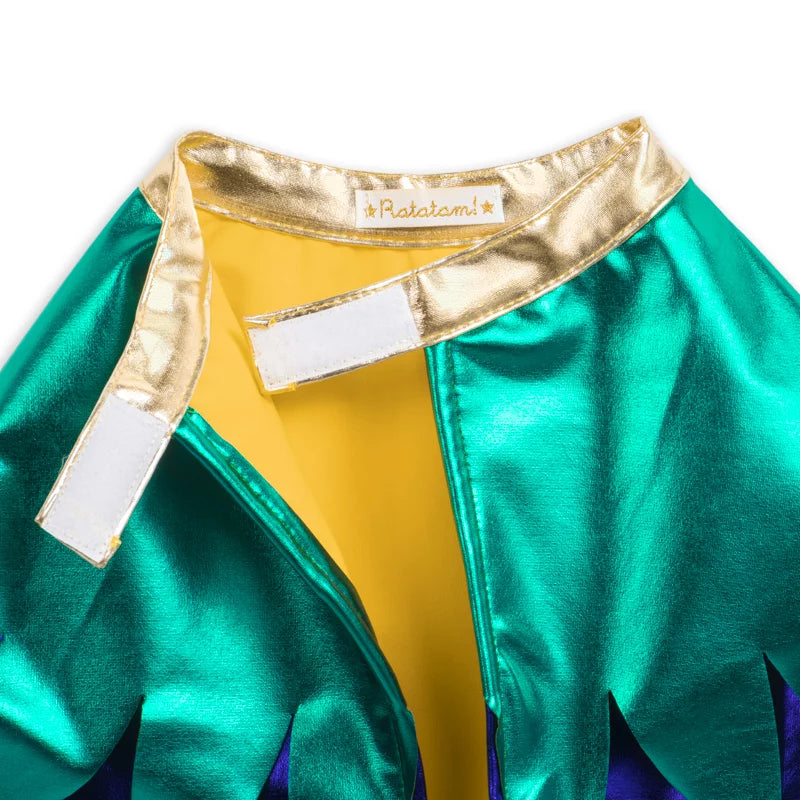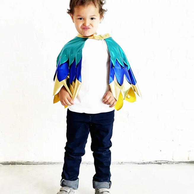 Deja que tus hijos vuelen hacia mundos de imaginación con este disfraz completo, que combina la elegancia de las alas metálicas con los vibrantes colores del ave del paraíso.