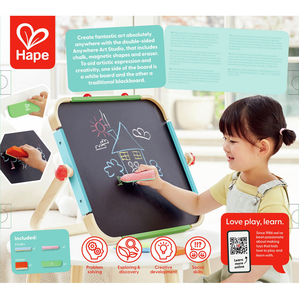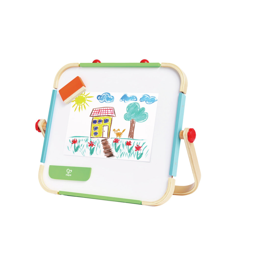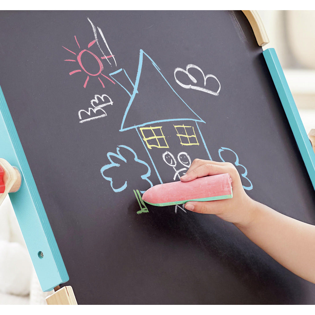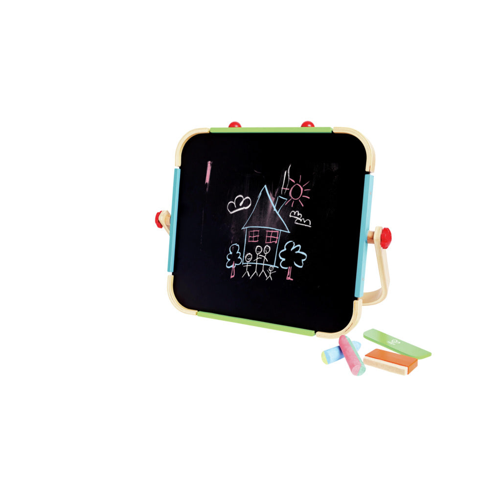 Este tablero de dibujo de doble cara es el compañero perfecto para dejar volar la imaginación estés donde estés. Por un lado tienes una pizarra blanca, por el otro una pizarra de tiza, y además ¡figuras magnéticas para dar un toque especial a tus creaciones!