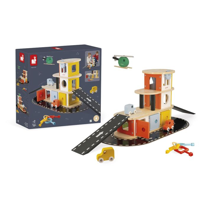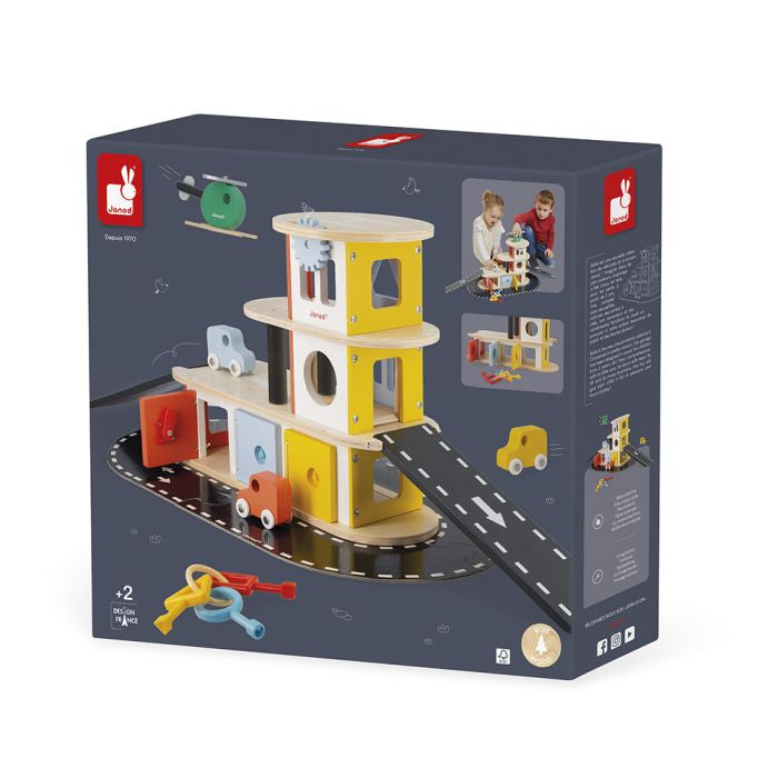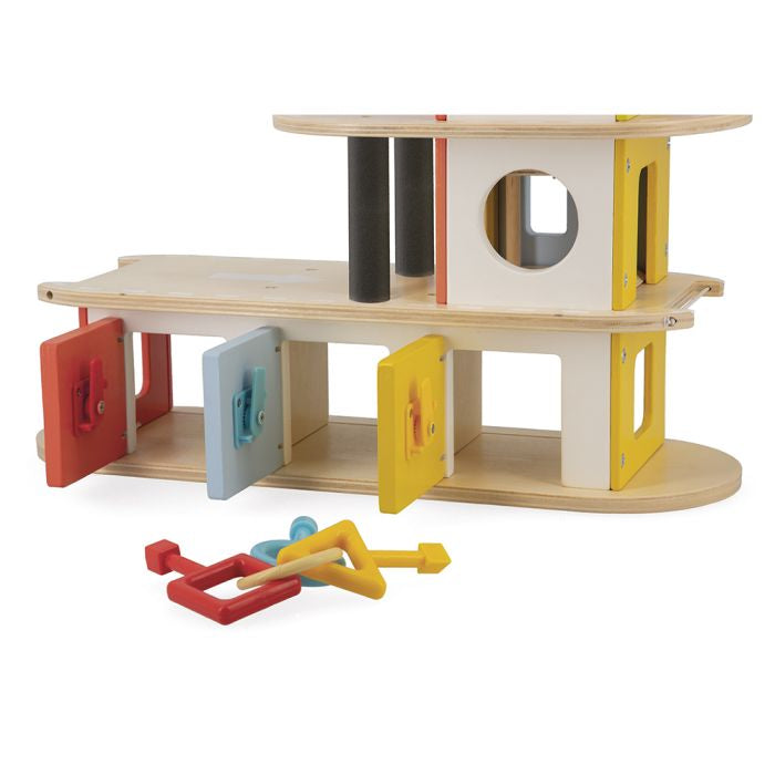- Caja de llaves: A partir de los 2 años, los niños podrán disfrutar de la caja de llaves incorporada, donde tendrán que elegir la llave correcta y la forma correcta para abrir las puertas del garaje y guardar los coches. ¡Una actividad educativa que además desarrolla la motricidad fina!