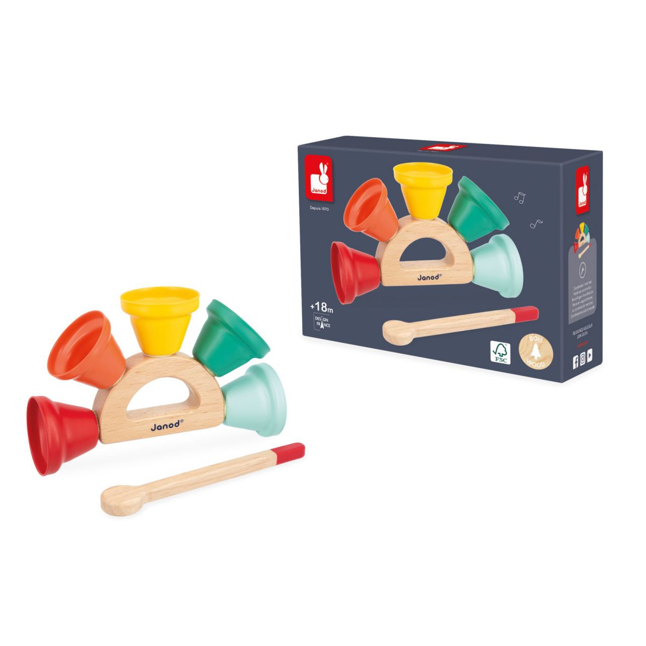 🎶 ¡Que suene la alegría! 🎶 Este juguete musical será el favorito de los bebés a partir de 18 meses. 🌟 Con 5 campanas de metal de colores brillantes, sujetas a un asa de madera, y una baqueta para tocarlas, este juguete es una verdadera fiesta de sonidos. 🛎️