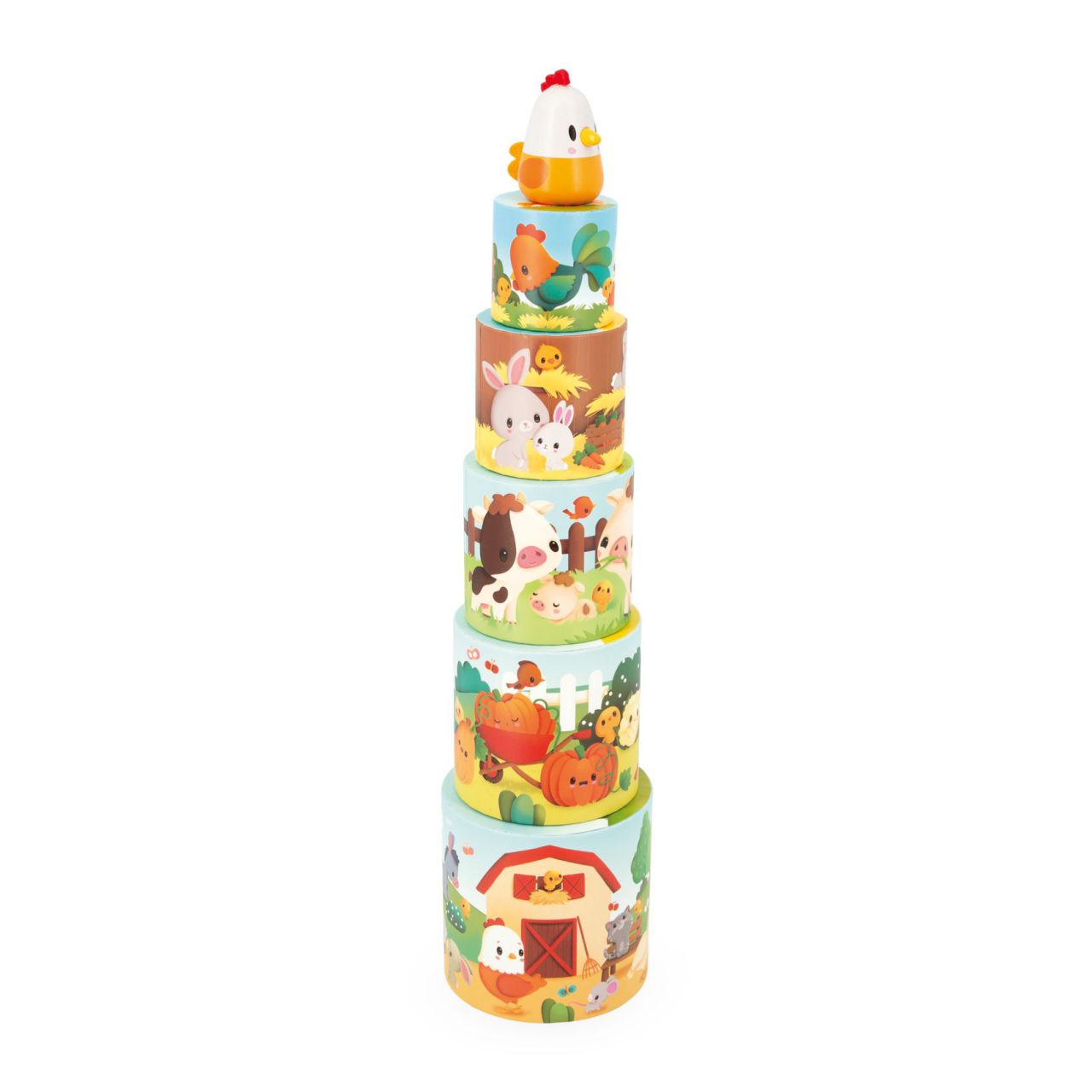 La pirámide incluye 5 formas apilables y una adorable figurita de madera: la mamá gallina que busca a sus pollitos, que se han ido a explorar la granja. 🌾 Puedes esconder la figura debajo de los cubos y animar al niño a encontrarla, o retarlo a buscar a todos los pollitos escondidos en las ilustraciones. 🐤