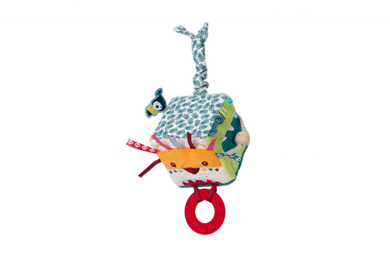 Descubre las actividades y las aventuras de este cubo de peluche inspirado en la jungla. El anillo mordedor le proporciona alivio durante la etapa de dentición. Estimula sus sentidos, sus habilidades motrices finas y su capacidad para sostener objetos.