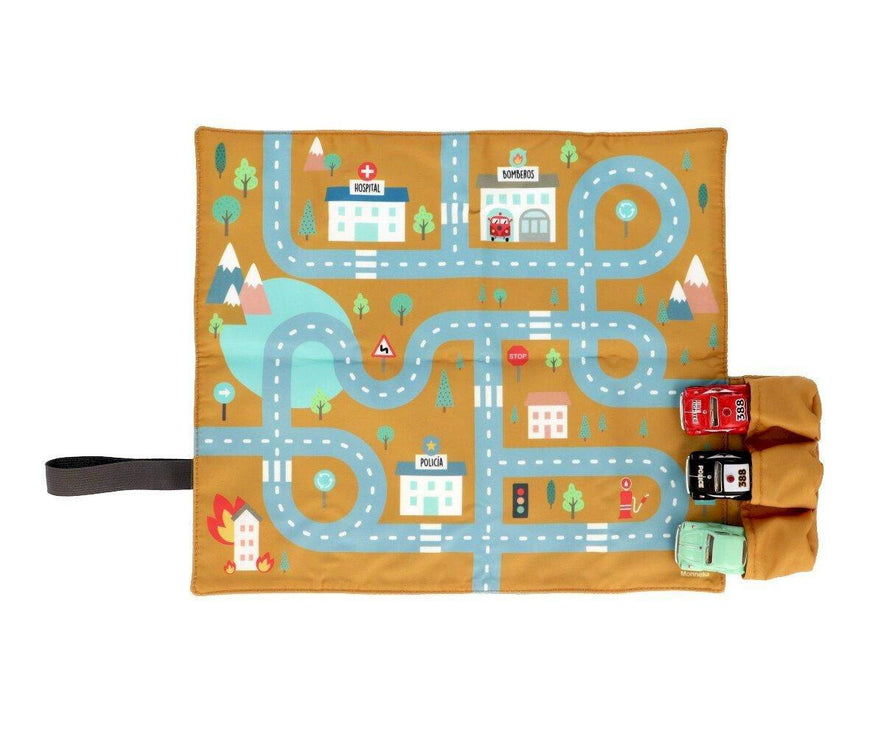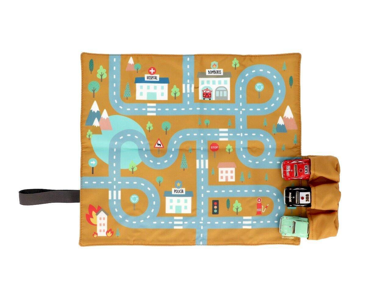 - 3 coches que se guardan fácilmente en los bolsillos "parking" del mantel.