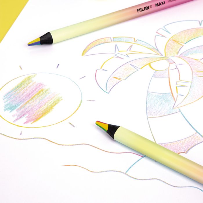 Lápices multicolor MAXI con mina de 5 mm Ø, sección redonda. Serie Sunset, la mina contiene 4 colores: amarillo, rosa, verde y lila. El tamaño MAXI es ideal para los más pequeños. La mina ofrece un trazo uniforme y es resistente a la rotura, gracias al sistema LPS (Lead Protection System) que protege la mina gracias a su adhesión con la madera. Madera de tilo en color negro. Procedente de plantaciones sostenibles.