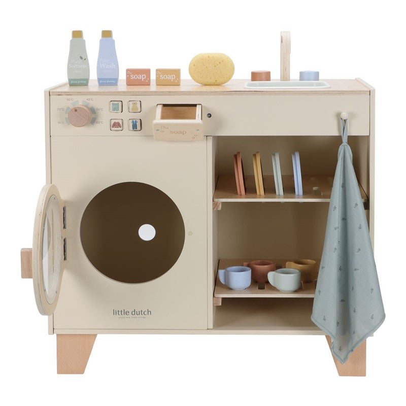 Con esta lavadora y lavavajillas de madera, las tareas del hogar se convierten en una auténtica aventura. El set incluye cuatro tazas, cuatro platitos, dos platos, detergente, pastillas de jabón y un paño de cocina. Lava los platos en el fregadero y lava la ropa de la muñeca en la lavadora. Los botones realistas con ilustraciones y el compartimento especial para la pastilla de jabón hacen que jugar sea aún más divertido. Combina la lavadora y el lavavajillas con la cocina de juguete y el frigorífico para crear un rincón de cocina completo. Diversión sin límites para los pequeños héroes del hogar.
