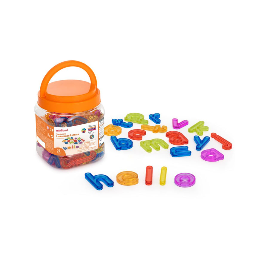 Set de letras minúsculas translúcidas en varios colores. A través de este juego, aprender las letras y el abecedario resultará mucho más divertido para los más pequeños. Apto para el juego sobre mesas de luz. 76pcs