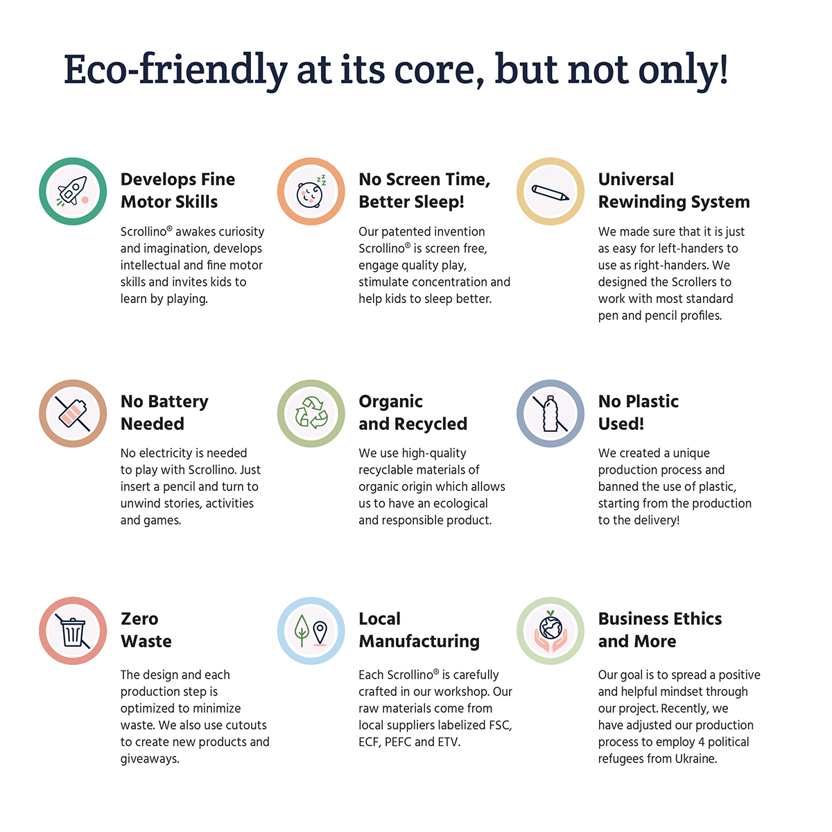 Un juego divertido para los niños y toda la familia. ¡Perfecto para un viaje largo en coche o un vuelo! Para empezar a disfrutar de este Scrollino, introduce un lápiz en el desplazador superior y gíralo en el sentido de las agujas del reloj. Tómate unas cuantas vueltas, recoge los artículos de primera necesidad y llega a la playa mientras evitas perderte en el laberinto. Para niños de 5 a 105 años. Idiomas disponibles: EN/ FR Edad: de 5 a 105 años Longitud: 2,2 yardas/2,02 metros Accesorio: 1 lápiz de madera natural incluido Papel pesado certificado por el FSC, libre de ácidos, Biofibra 100% compostable Diseñado en Francia - Fabricado en Praga