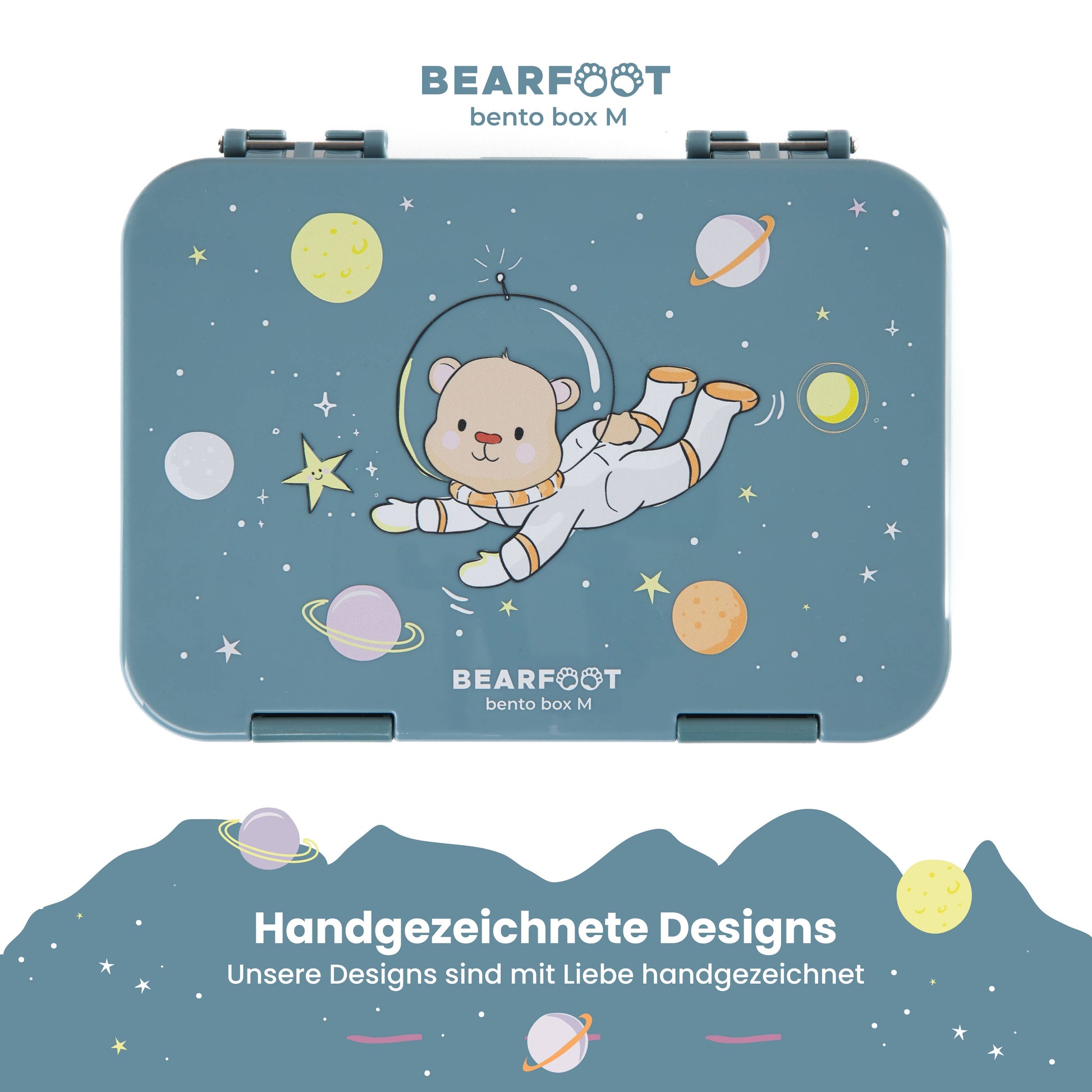 Haz de cada comida una aventura galáctica con esta encantadora lonchera de color azul brillante, decorada con un adorable oso dibujado a mano explorando el espacio. Ideal para niños que buscan diversión incluso en la hora del almuerzo.