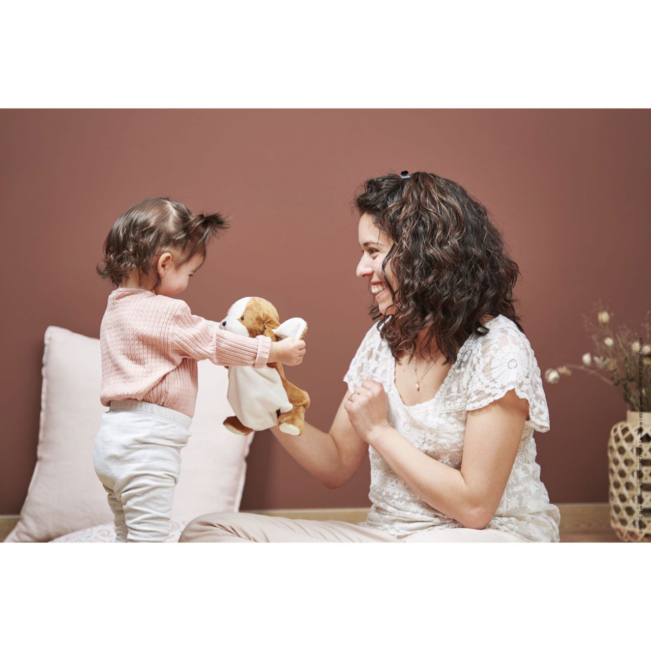 Tiramisu, el perrito basset hound, es un peluche muy bonito que acompañará al bebé en sus aventuras. Con sus largas orejas y sus pequeñas patas, que también servirán como puntos de sujeción fáciles de agarrar para las manos pequeñas, será el compañero ideal. Su pequeño pañuelo azul, emblema de la colección Les Amis de Kaloo, le da un pequeño toque simpático y moderno. La función de marioneta permite el juego interactivo entre el bebé y sus padres, y su barriga extrasuave es ideal para dar abrazos. Desde el nacimiento.