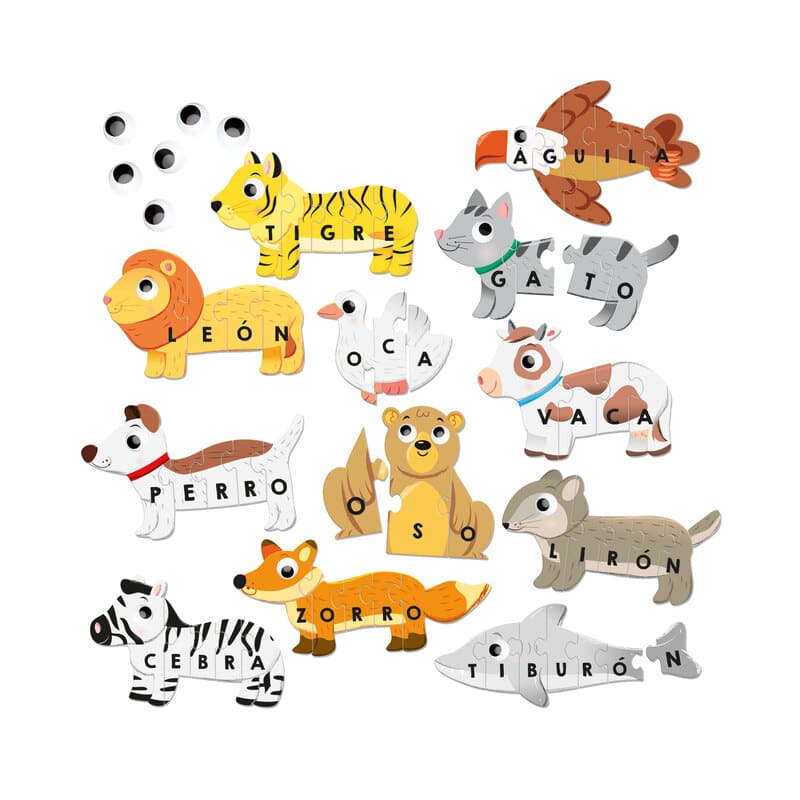 Un juego perfecto para que los peques aprendan a leer y escribir de forma divertida. 📝🐶 Coloca los puzzles autocorrectivos, une las piezas con los nombres de los animales y descubre cómo se escriben. Además, dale vida a cada animal pegándole ojos adhesivos. 👀🎉