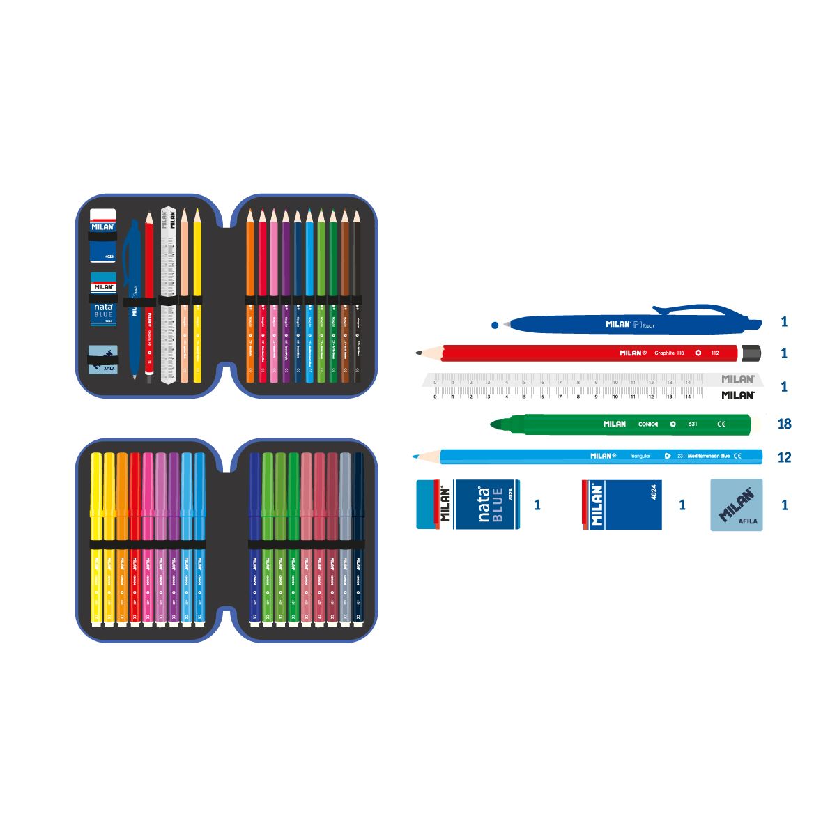Estuche de 2 pisos que permite mantener el material escolar siempre ordenado y de fácil acceso. Material incluido: 2 gomas de borrar (4024 y Nata blue), 1 sacapuntas AFILA, 1 lápiz de grafito HB, 1 bolígrafo P1 tinta azul, 1 regla triangular de 15 cm, 12 lápices de colores triangulares y 18 rotuladores de punta cónica. Color azul, amarillo y verde. Serie especial Blue Odyssey con dibujos de fauna marina para descubrir la diversidad de animales del mar. Se puede combinar con los cuadernos para colorear. Composición tejido: poliéster. Medidas: 19,5 x 13 x 5 cm.