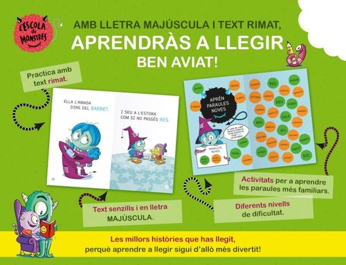 APRÈN A LLEGIR A L'ESCOLA DE MONSTRES Amb lletra majúscula i text rimat aprendràs a llegir ben aviat! L'Anna i la Jana són bessones idèntiques, i totalment diferents! A una li encanta jugar i l'altra no sap on començar. Els monstres de classe mai volen anar amb ella! Però el seu profe té un pla... les germanes s'intercanviaran! Algú ho notarà?