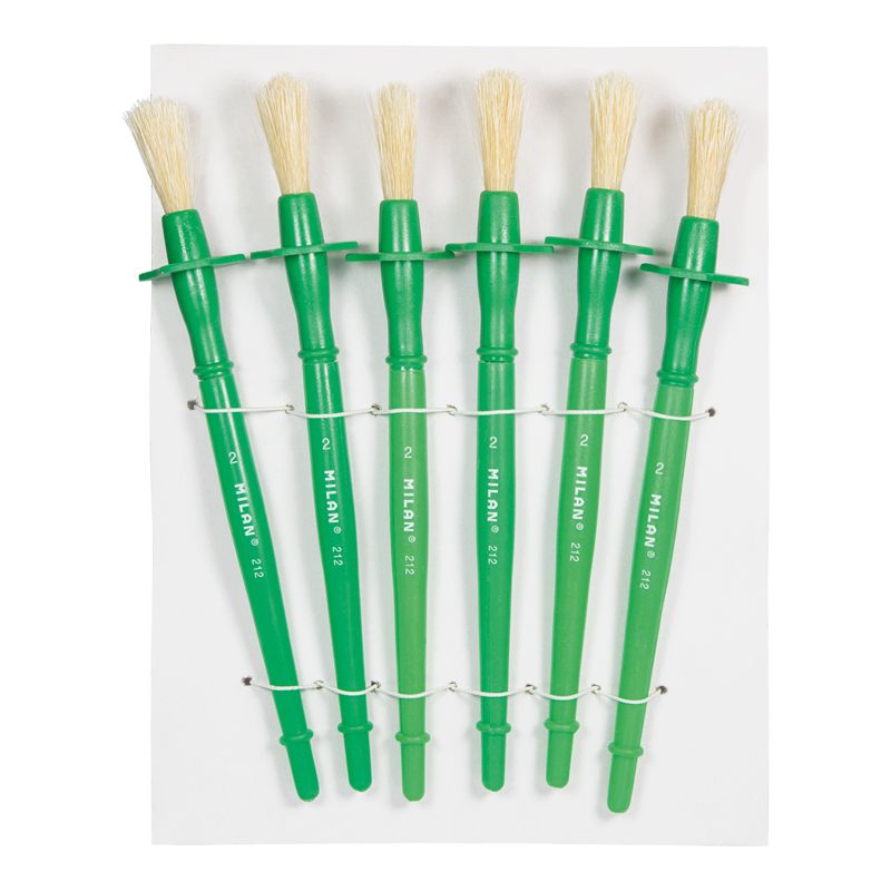 Pincel redondo con mango corto de plástico verde. La virola de plásticocuenta con una arandela protectora para evitar que la pintura invada y manche el mango. También permite colocarlo en posición horizontal sin que el pelo esté en contacto con la superfície de trabajo ni ruede sobre la mesa. Composición: pelo natural de cerda Chungking. Adecuado para cola, barnices y témpera. Diámetro del pelo: 9,5 mm. Longitud del pelo: 29,9mm. Longitud del pincel: 178 mm.